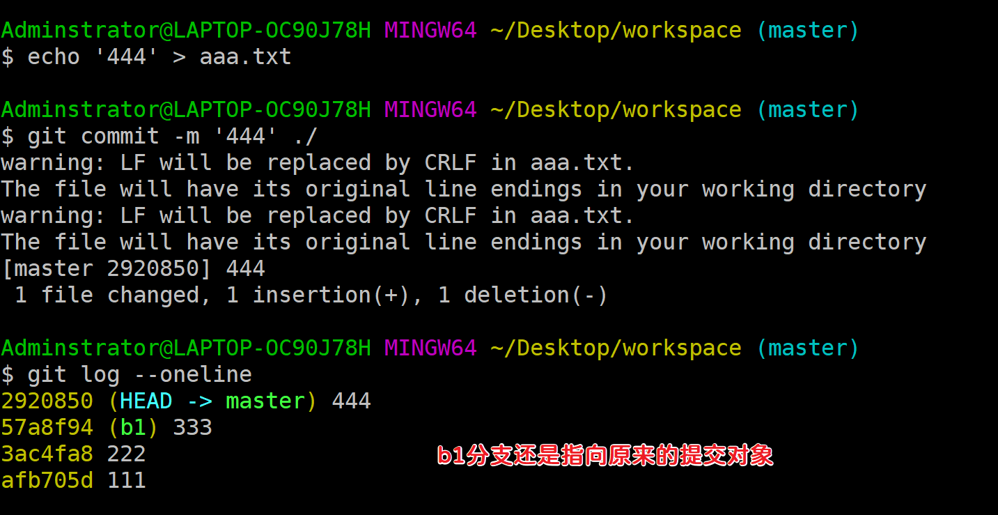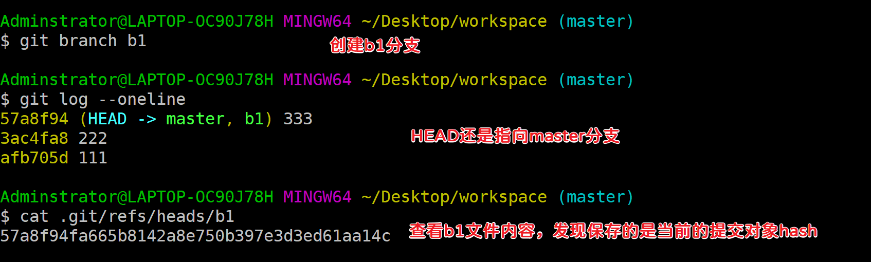 Adminstrator@LAPTOP-OC90J78H MINGW64 ~/Desktop/workspace (master) # 在当前位置创建b1分支