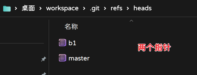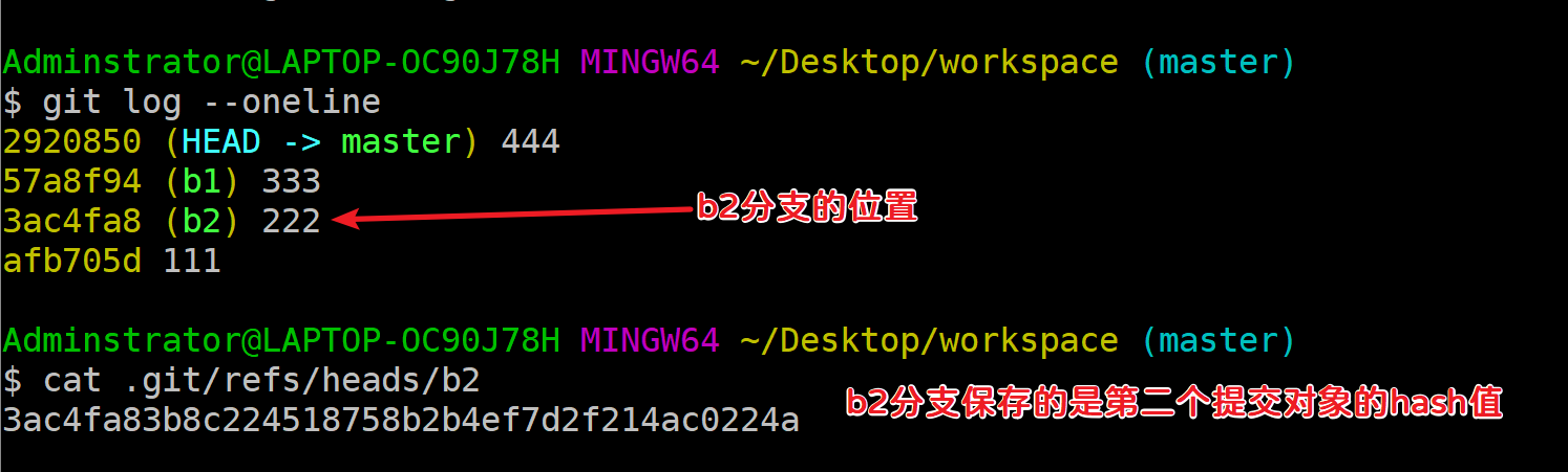 Adminstrator@LAPTOP-OC90J78H MINGW64 ~/Desktop/workspace (b1) # HEAD指针指向了b1分支
