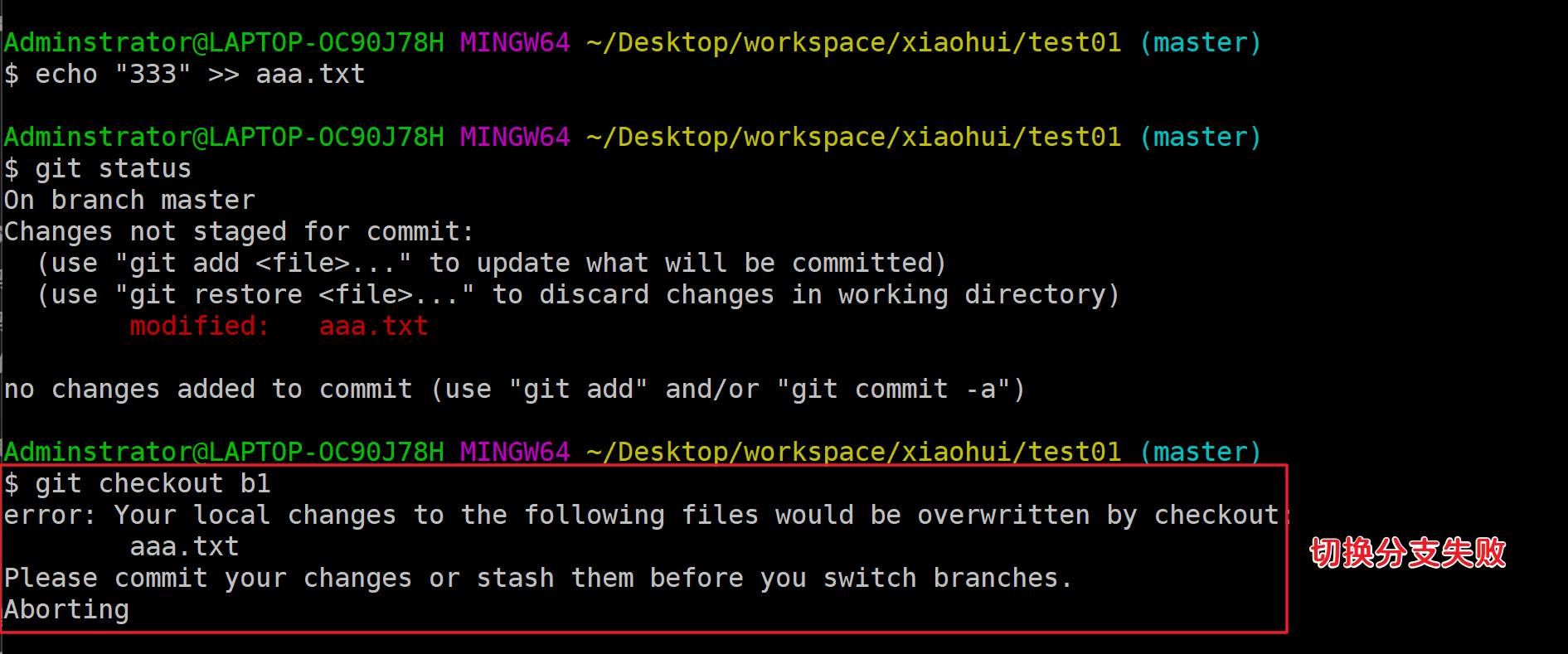 Adminstrator@LAPTOP-OC90J78H MINGW64 ~/Desktop/workspace (master) # 切换到b1分支