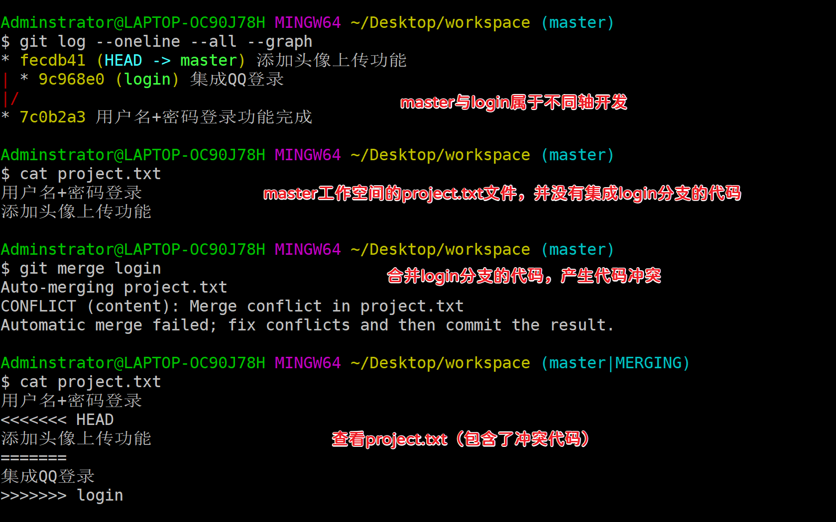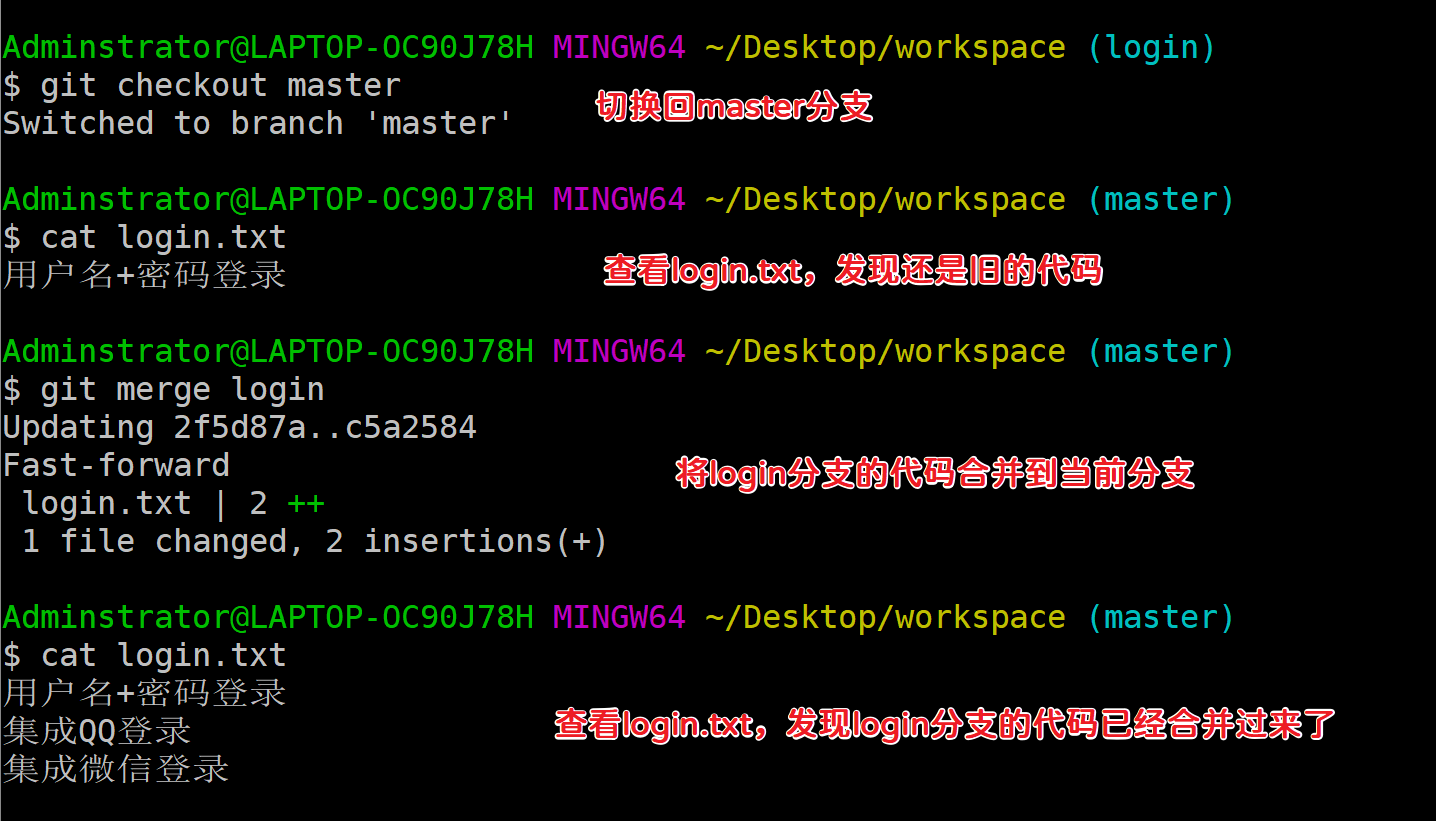 Adminstrator@LAPTOP-OC90J78H MINGW64 ~/Desktop/workspace (master) # 查看文件内容(并没有发生变化)