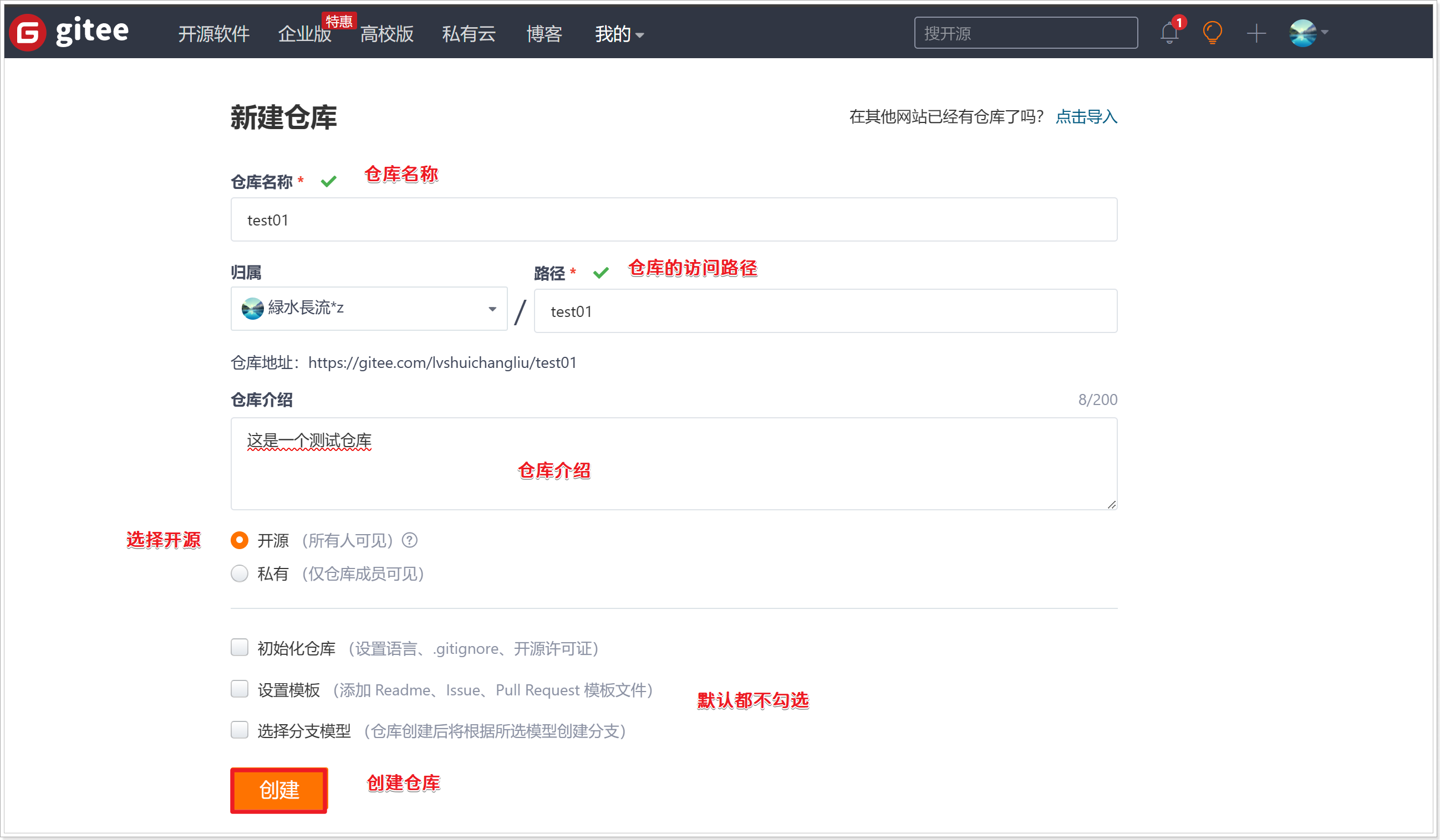 首先在Gitee创建一个仓库: