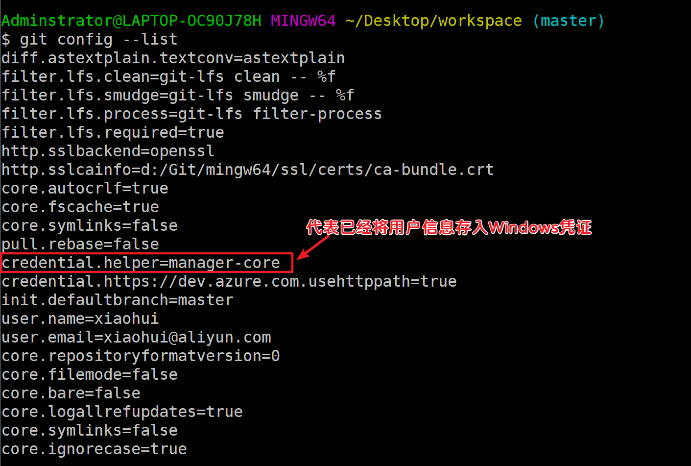 Adminstrator@LAPTOP-OC90J78H MINGW64 ~/Desktop/workspace (master) # 查看仓库信息