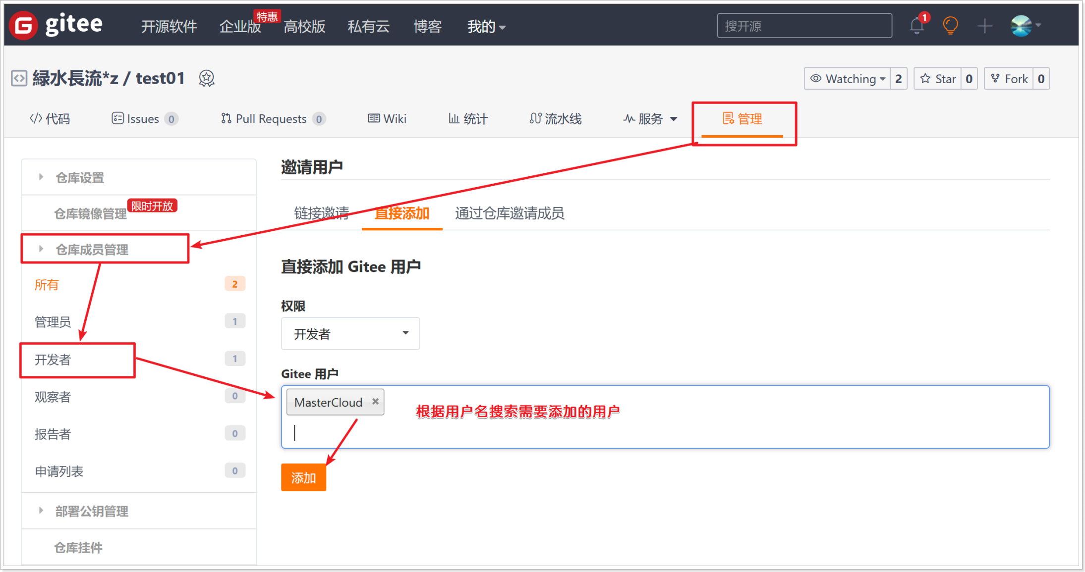 - 1)在项目管理中添加开发者: