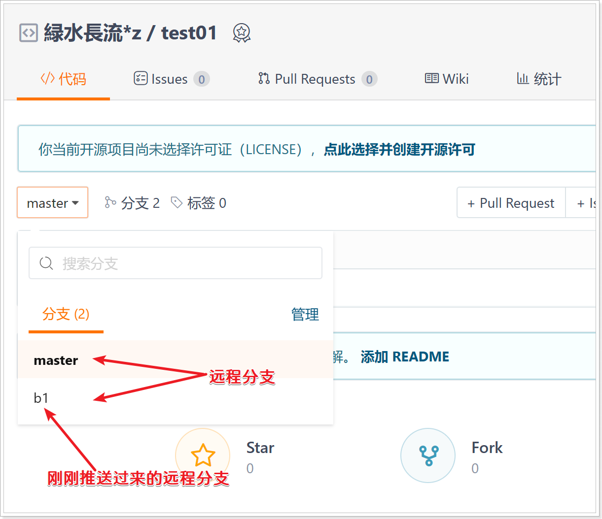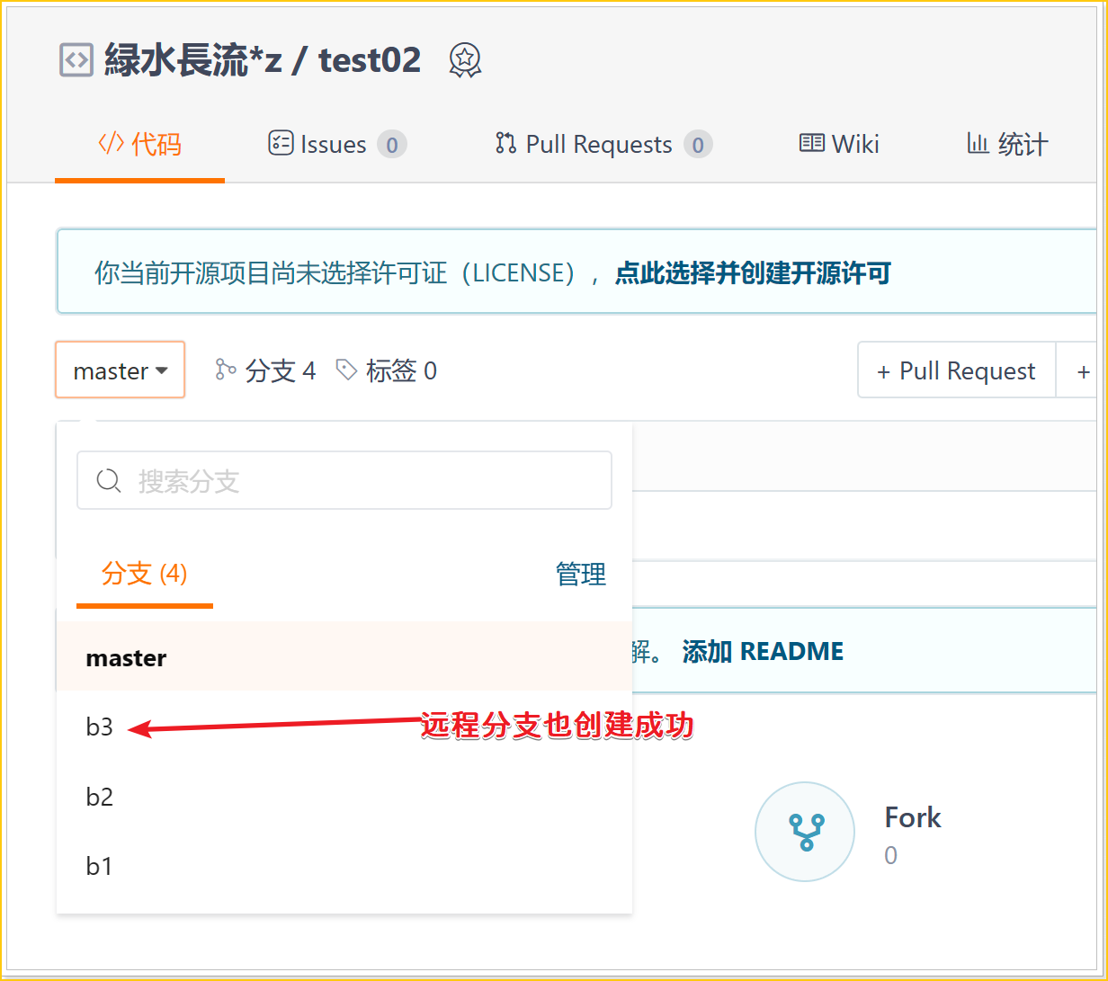 Tips:刚刚使用push命令仅仅是把master分支推送到远程仓库了,b1和b2分支并没有推送到远程仓库,因此没有创建b1和b2分支的远程跟踪分支