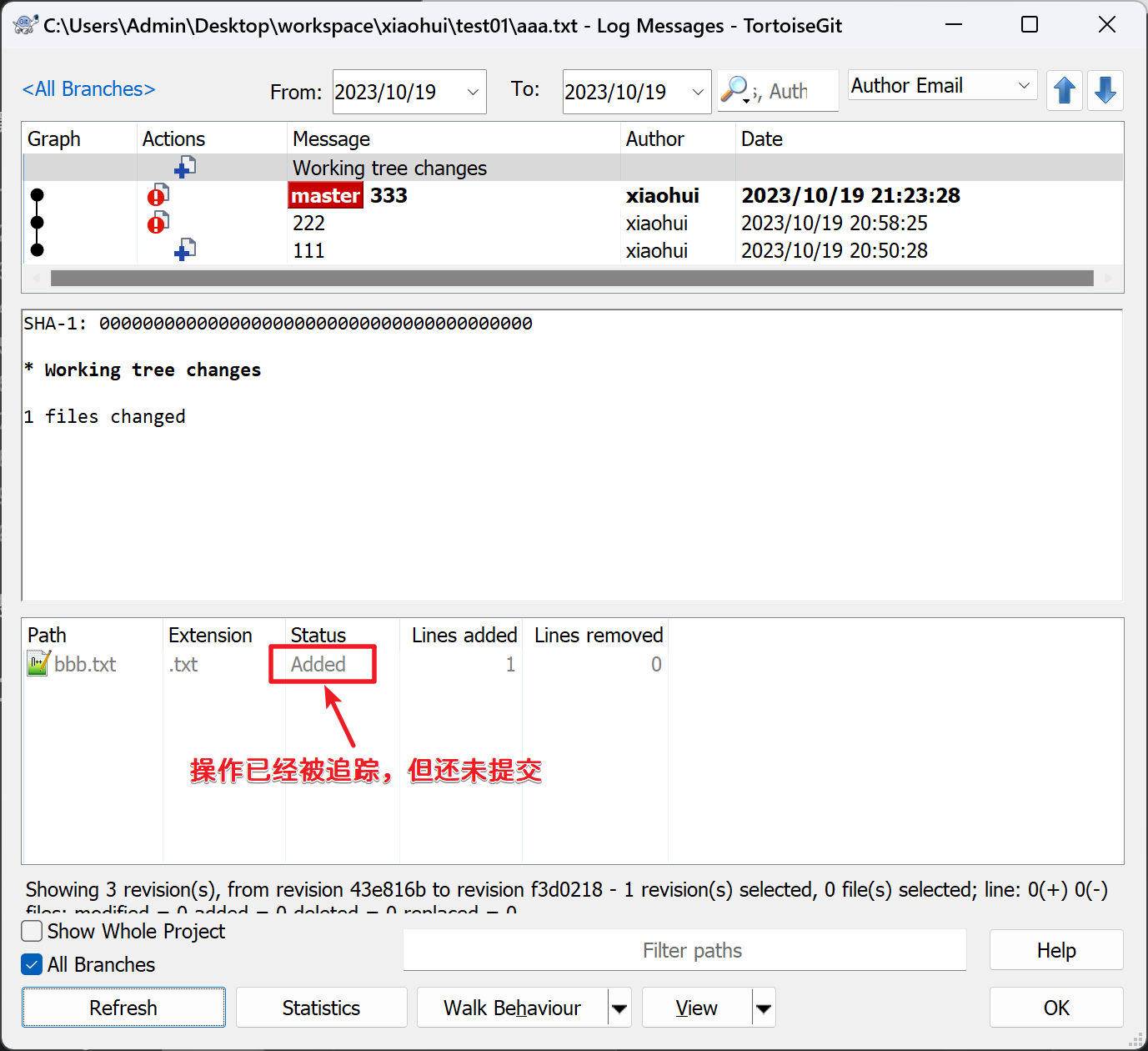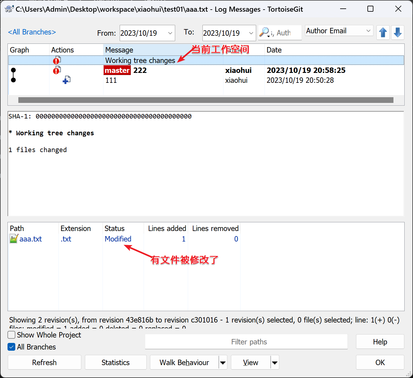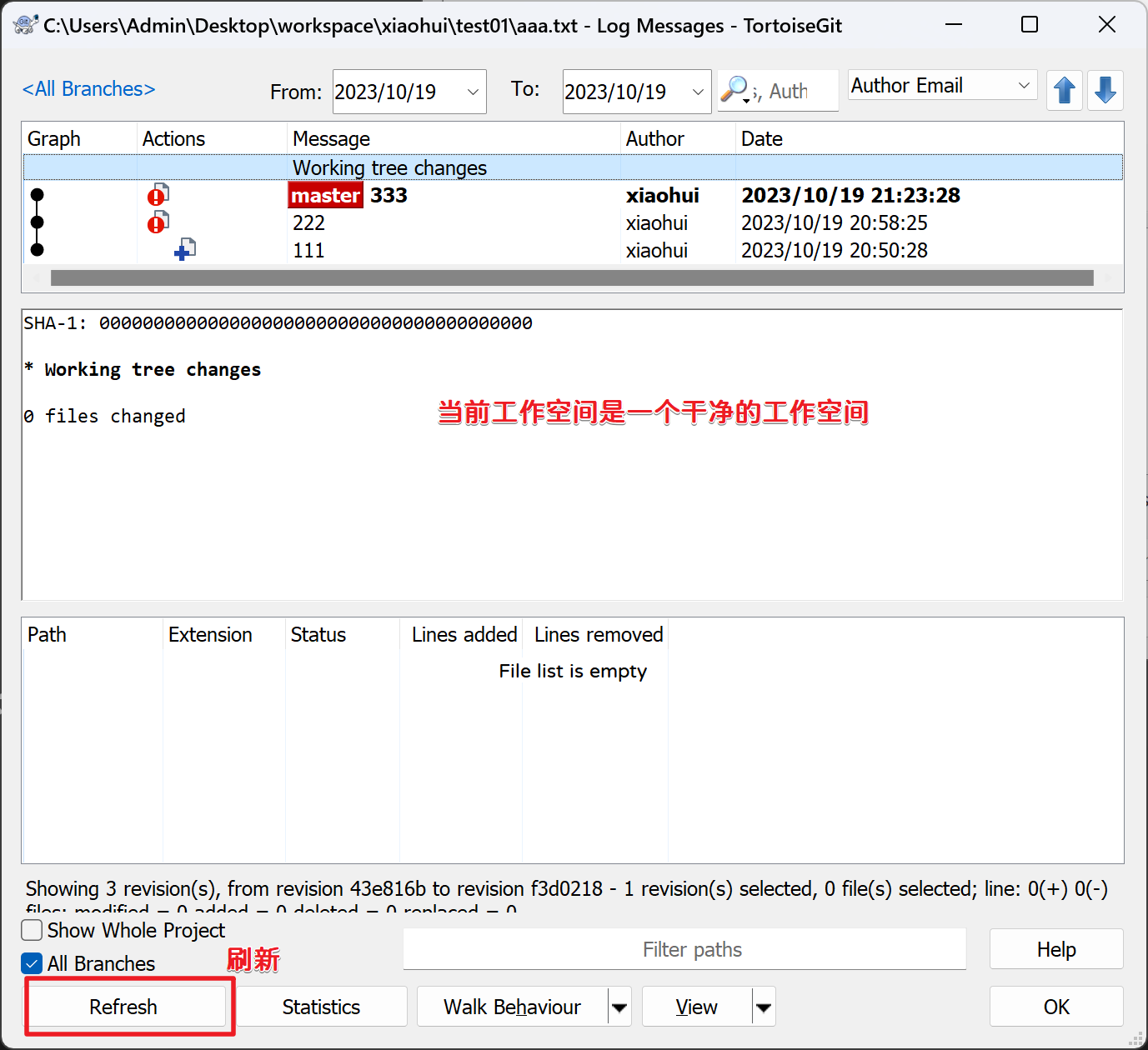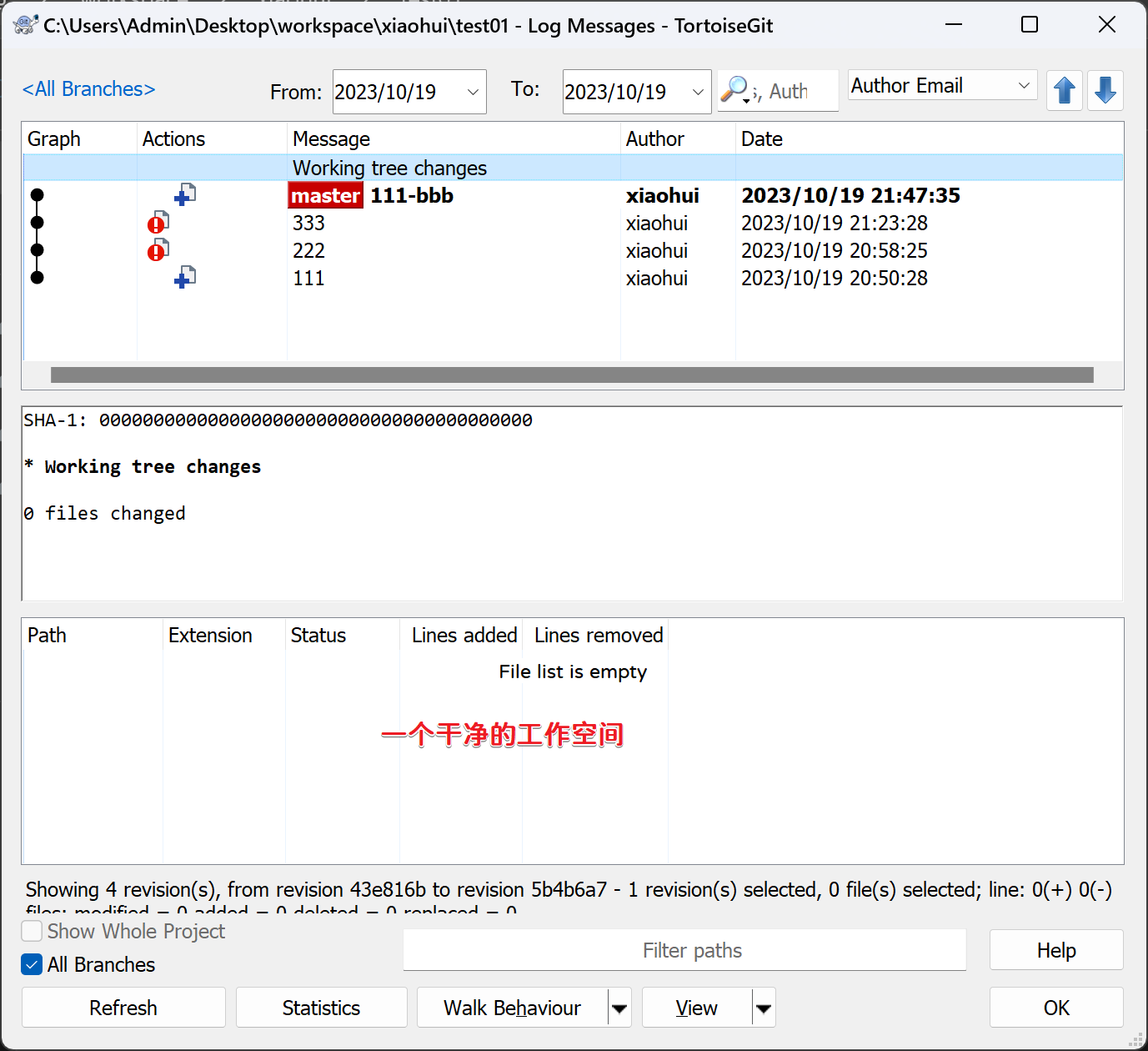 查看Git日志和工作空间: