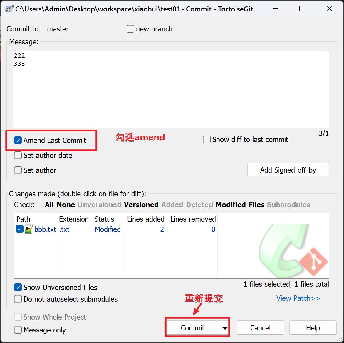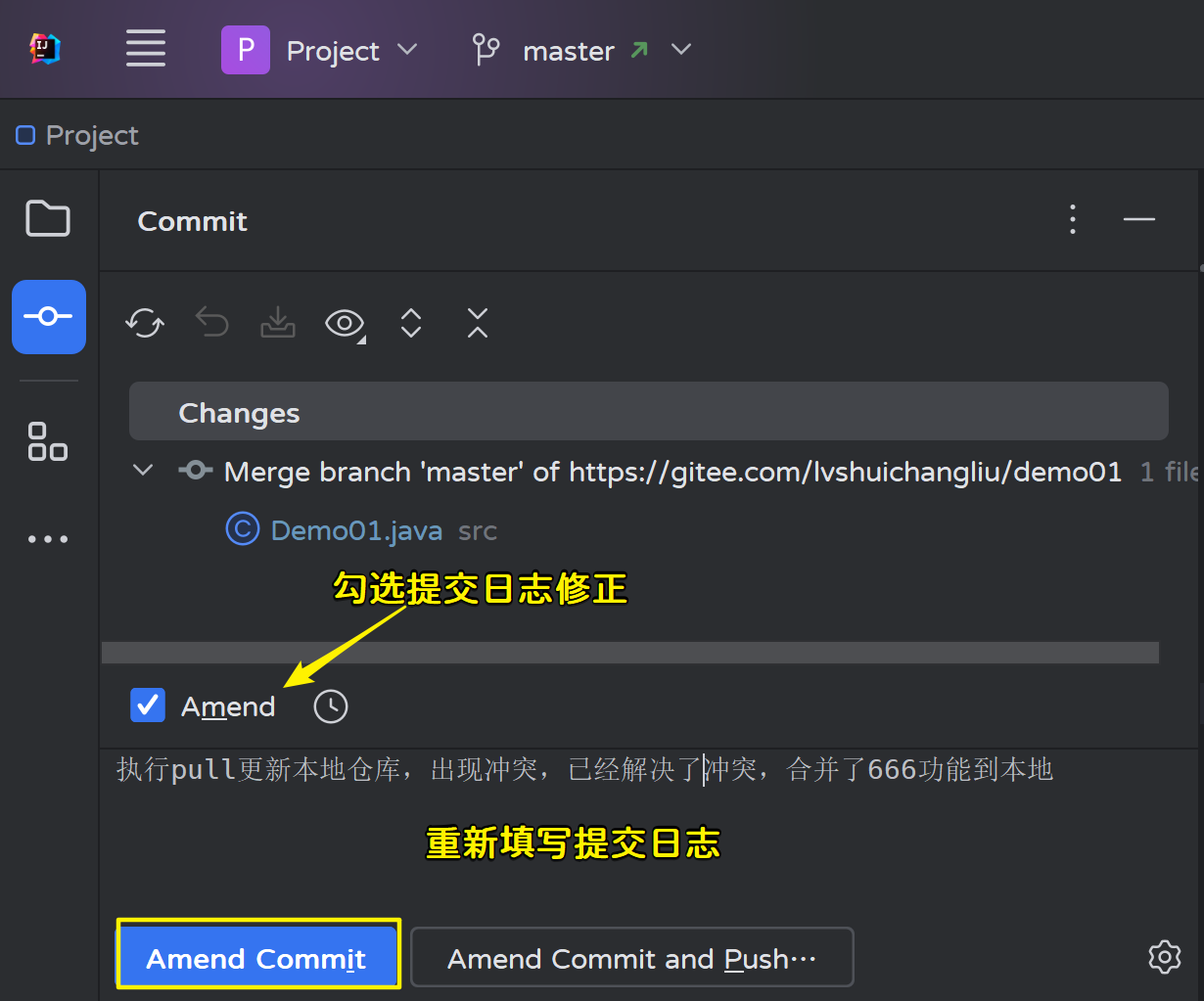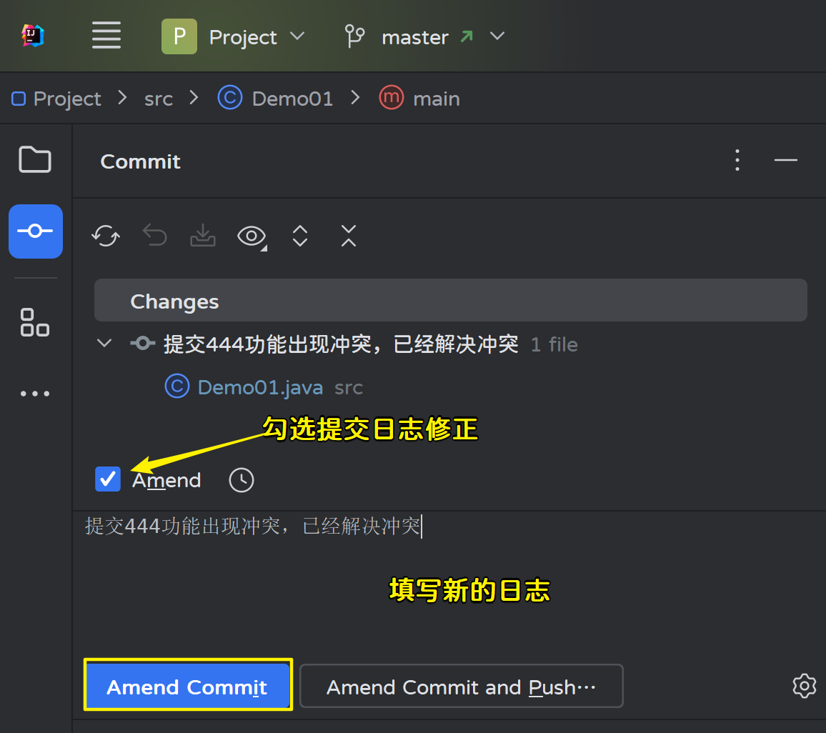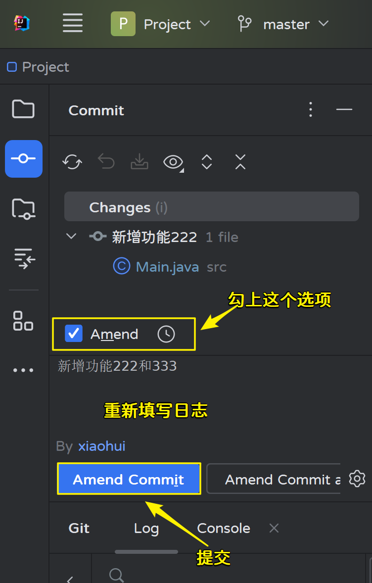 我们可以使用amend来修改提交日志: