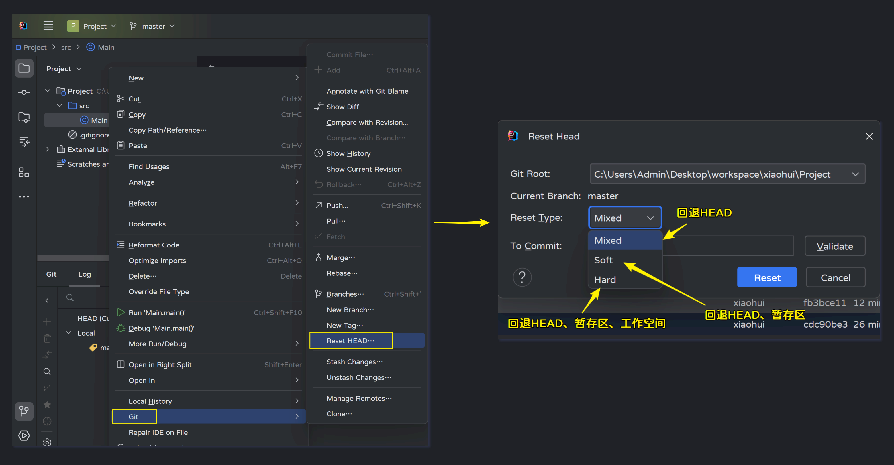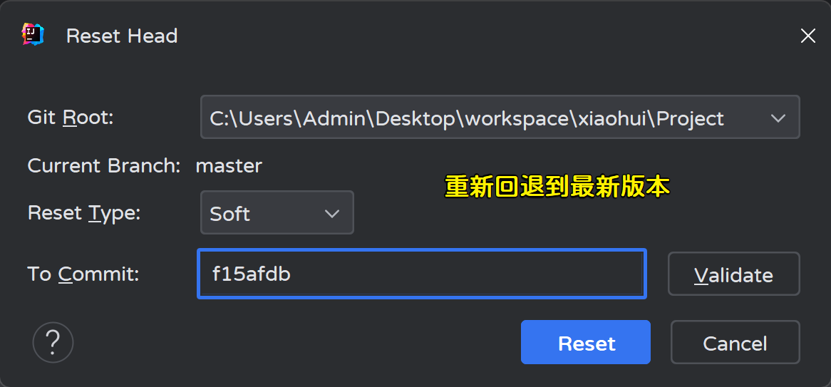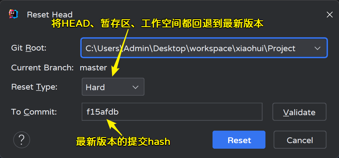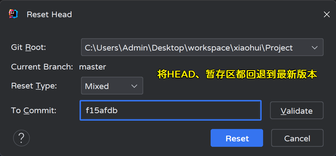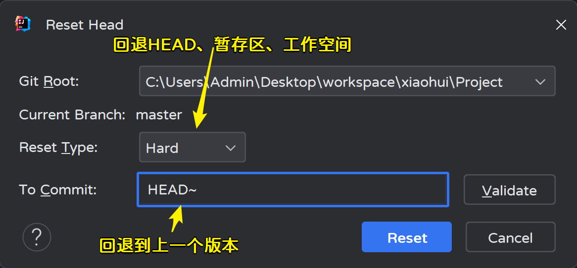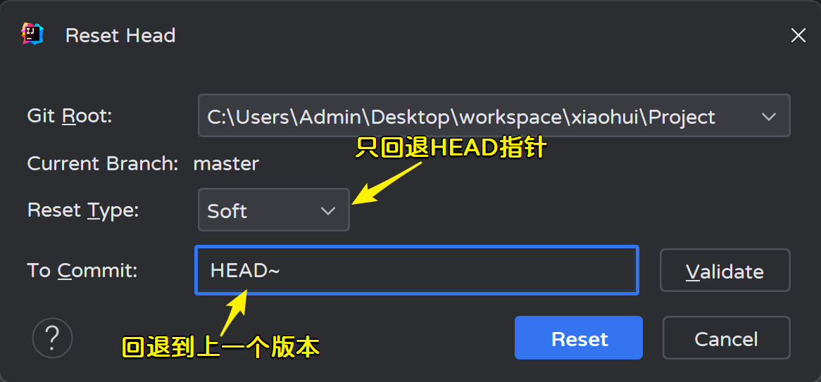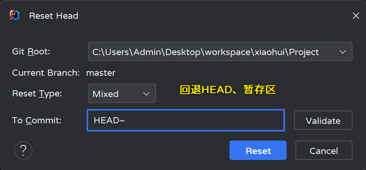 Adminstrator@LAPTOP-OC90J78H MINGW64 ~/Desktop/workspace/xiaohui/Project (master) # HEAD指针移动了