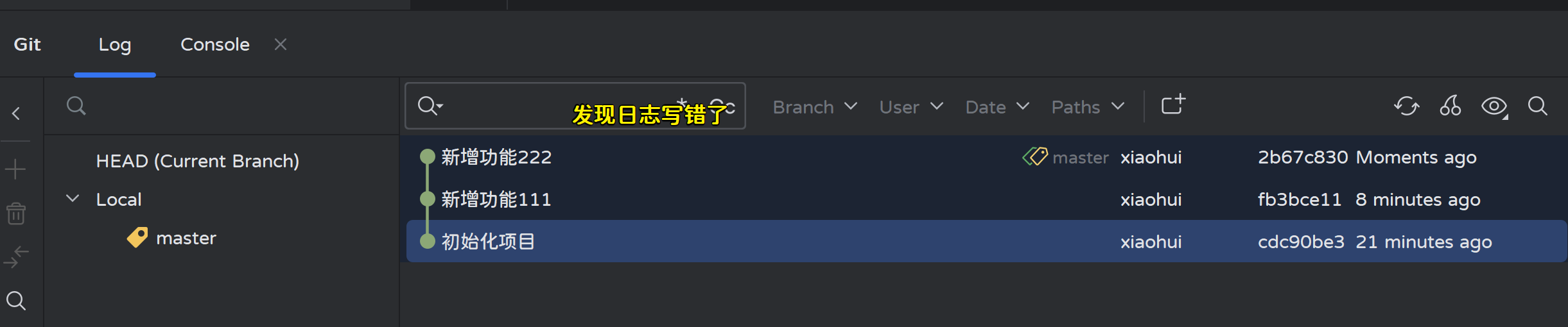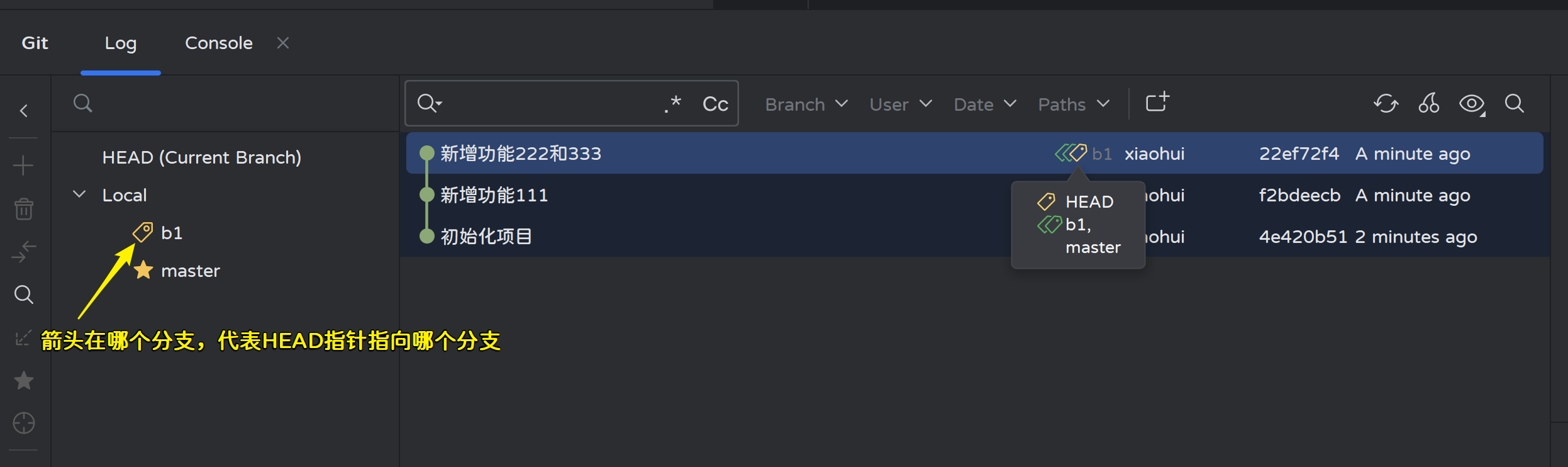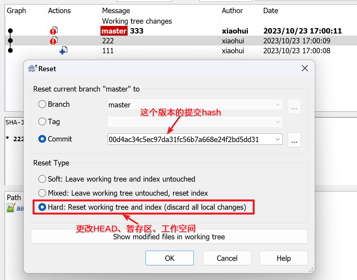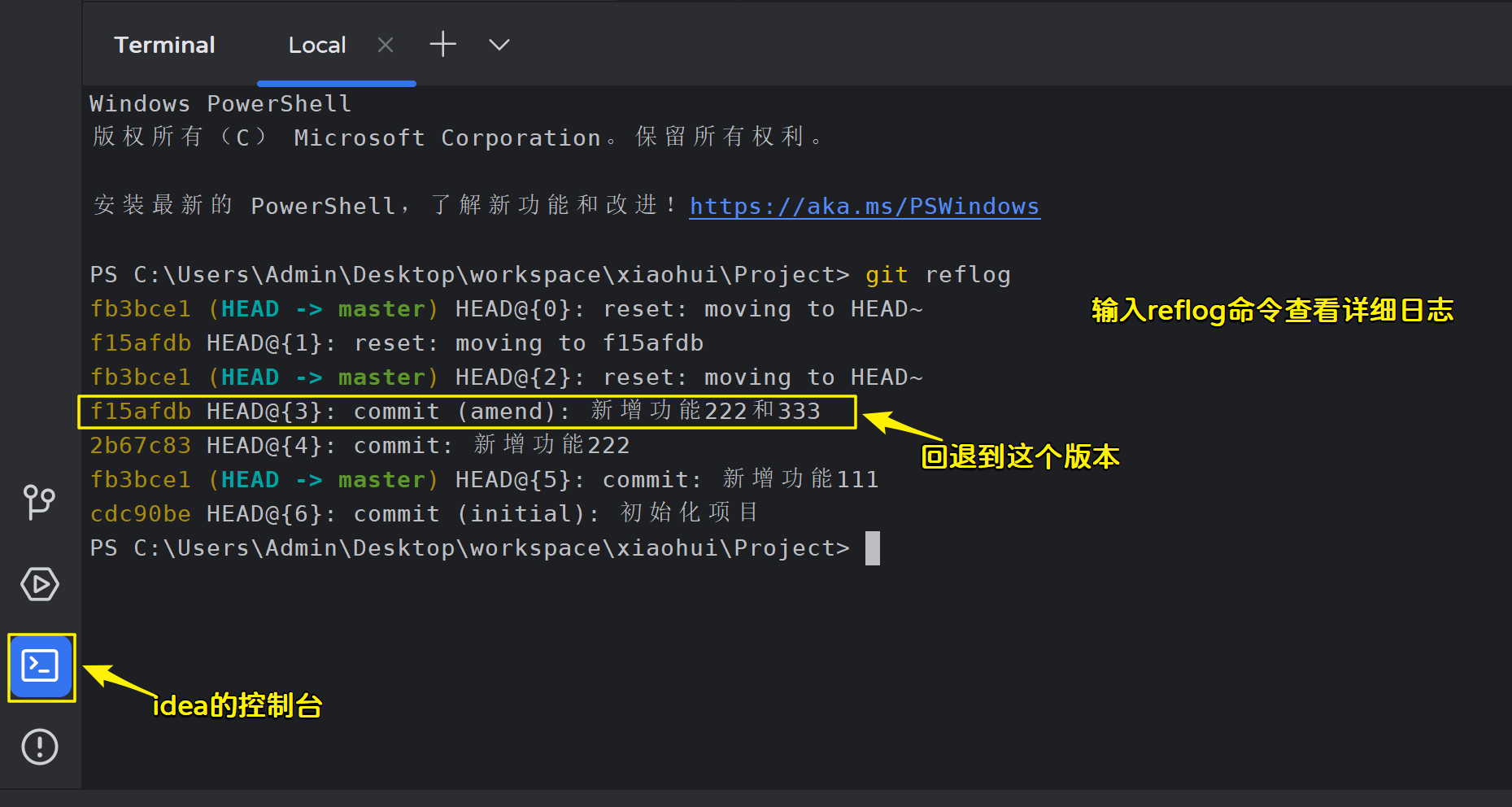 Adminstrator@LAPTOP-OC90J78H MINGW64 ~/Desktop/workspace/xiaohui/Project (master) # HEAD指针移动了