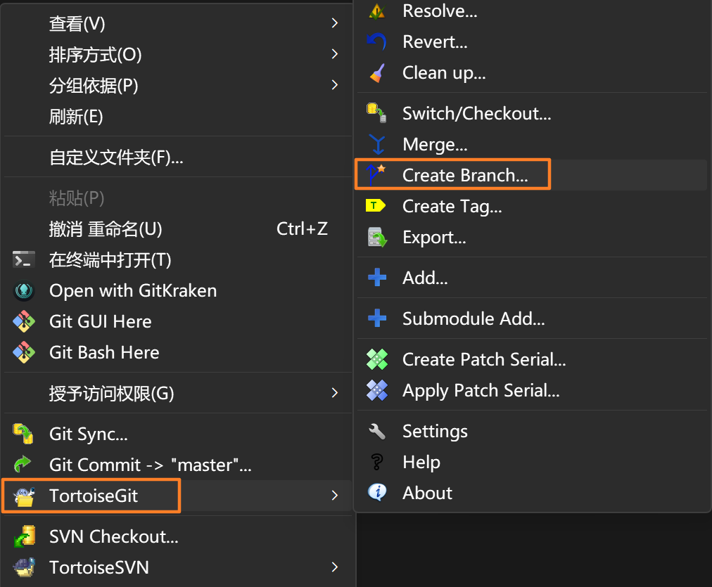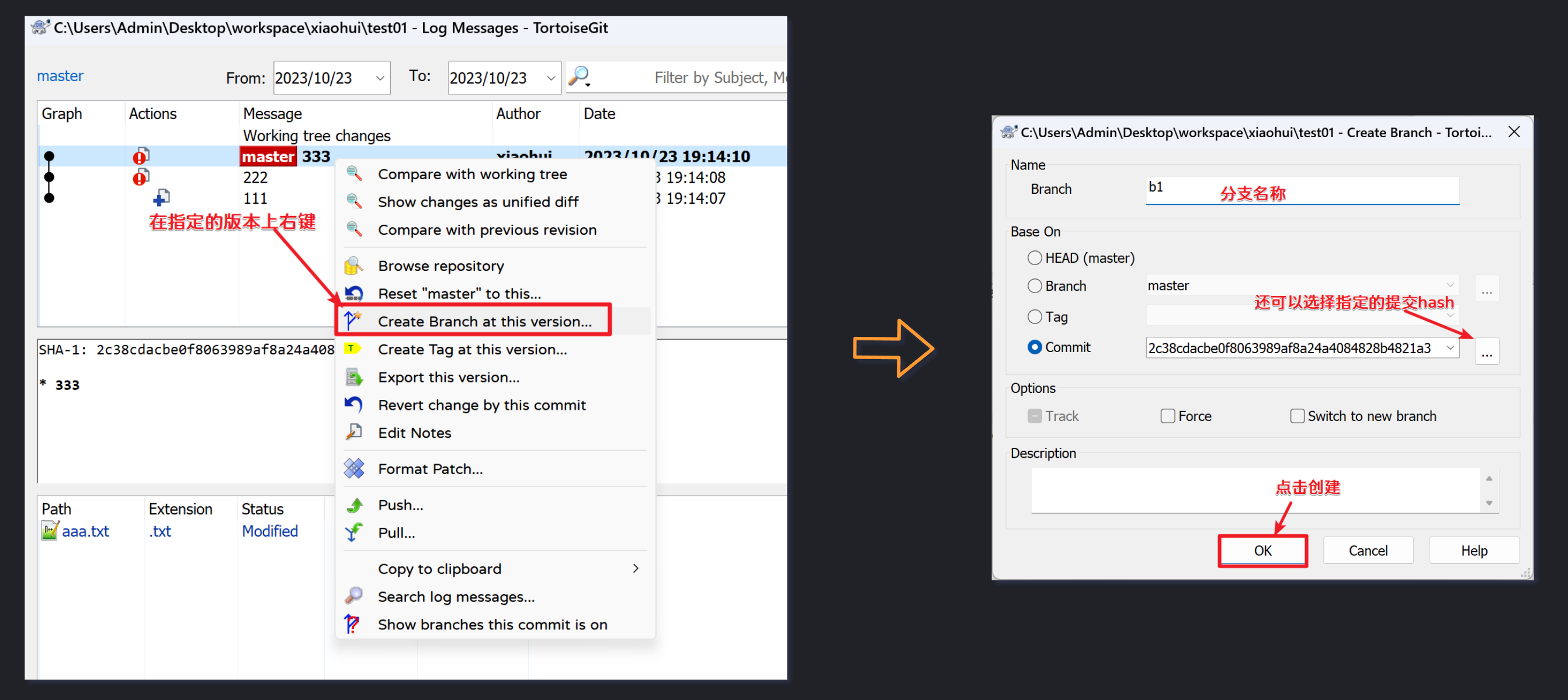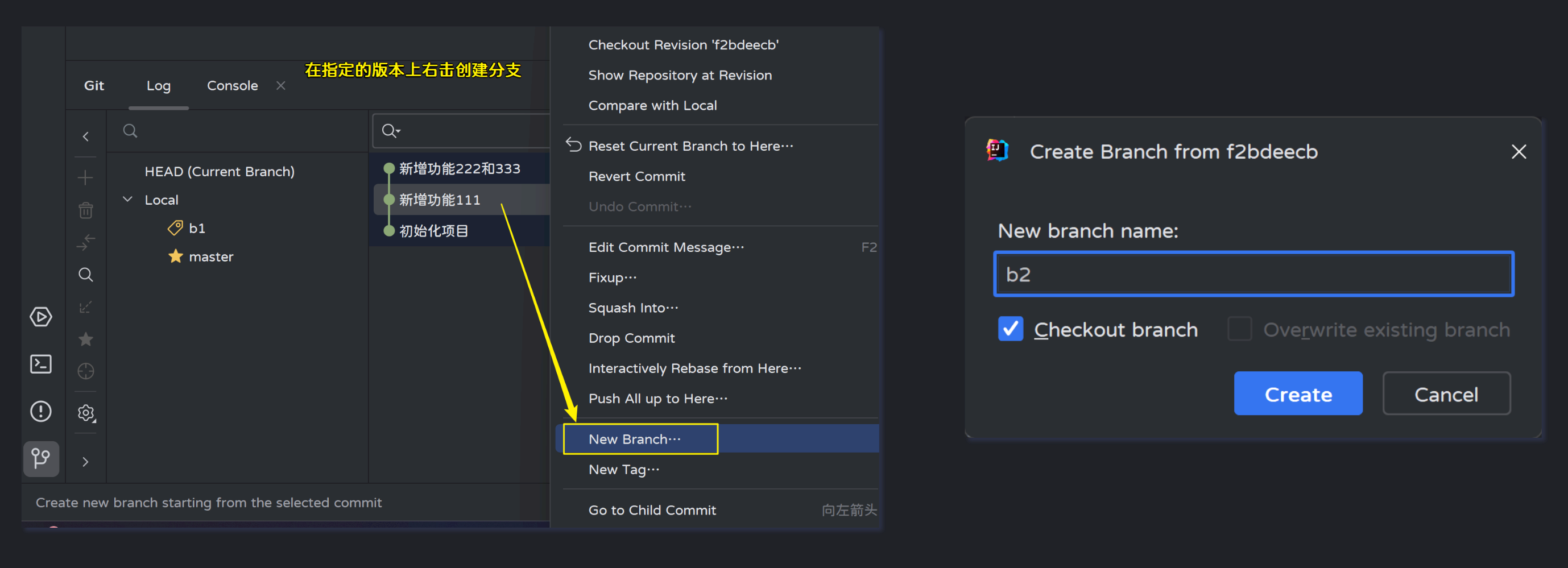 也可以在指定的版本上右击来创建分支: