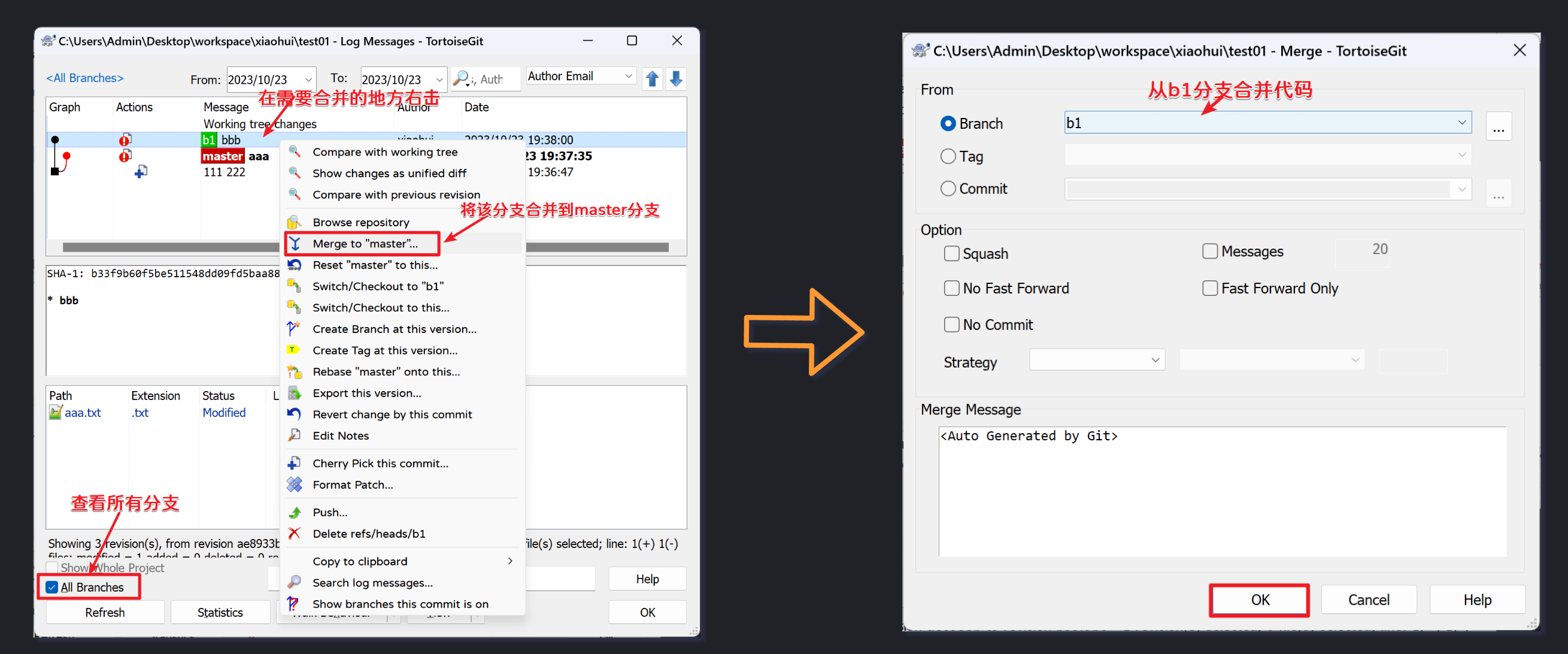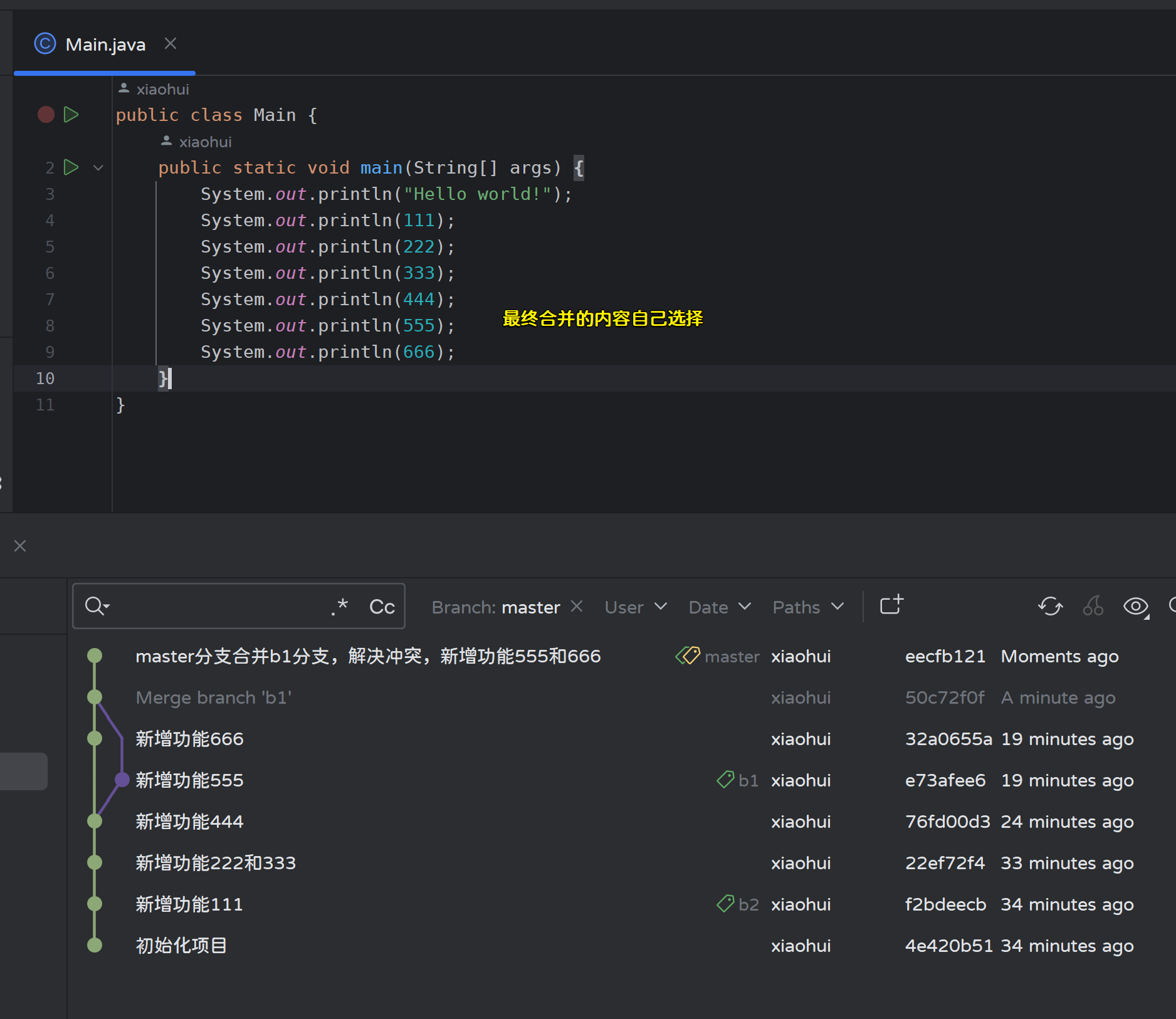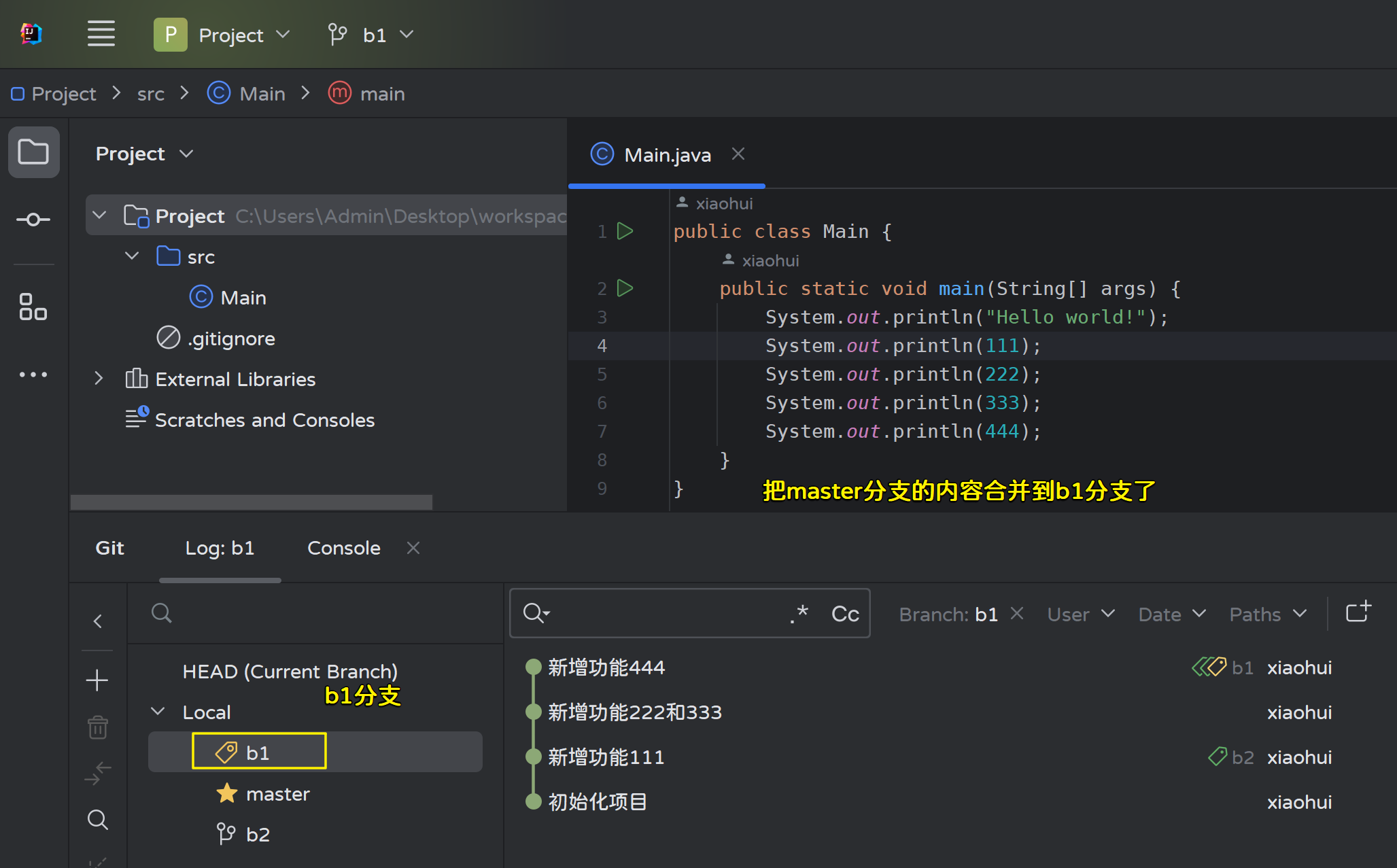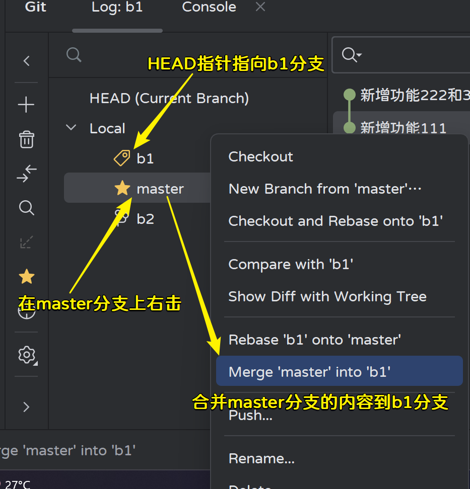 使用master分支合并b1分支的内容:
