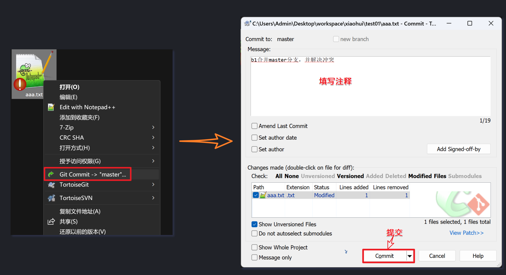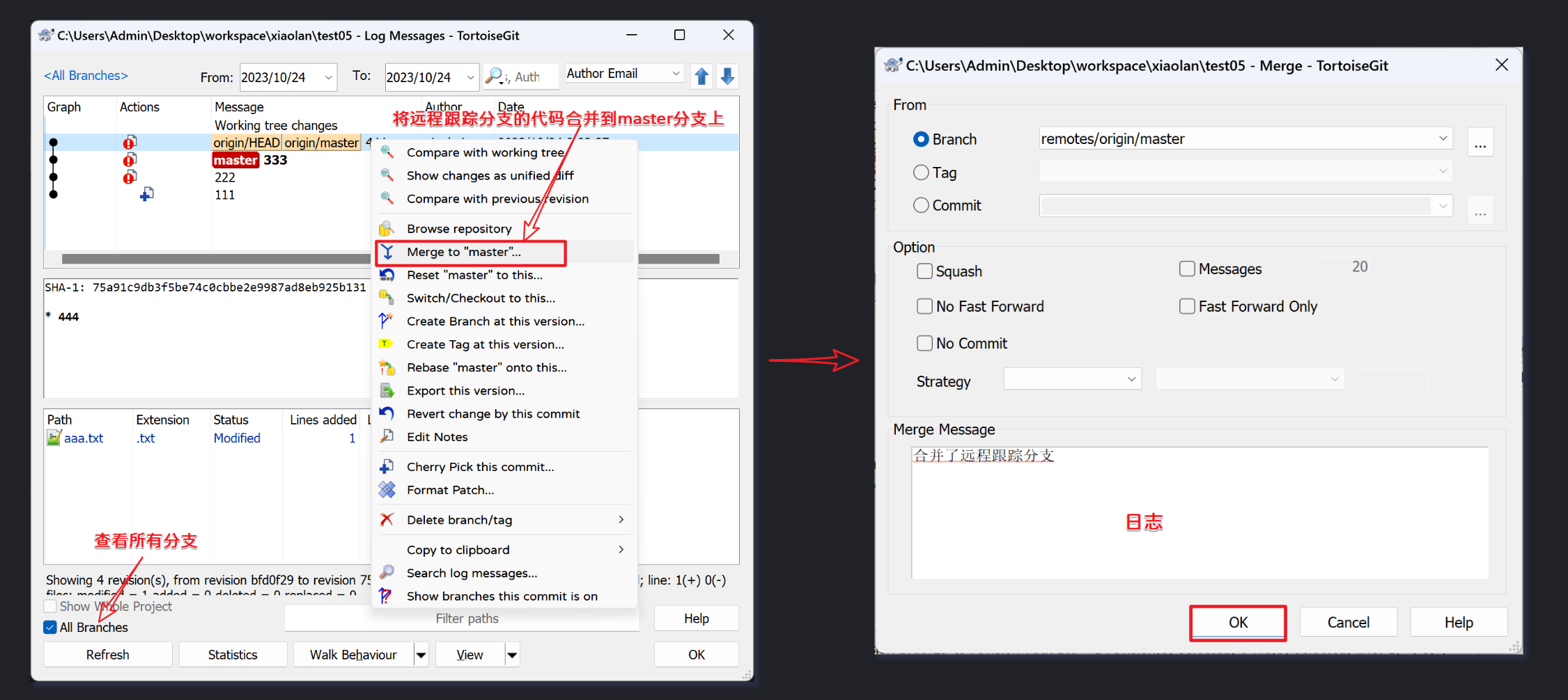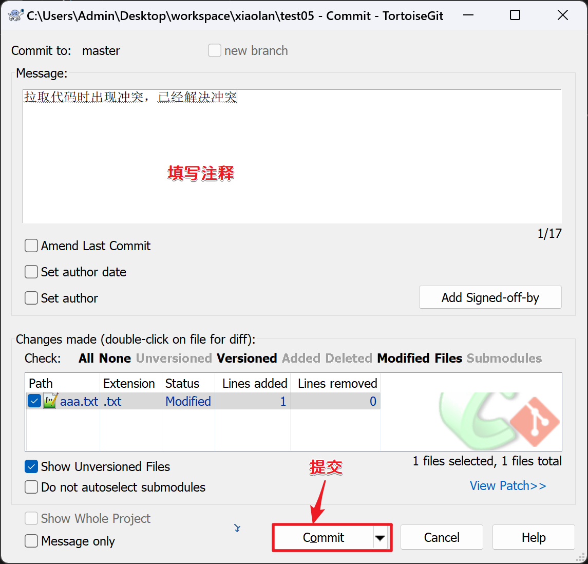 合并完成,填写日志提交: