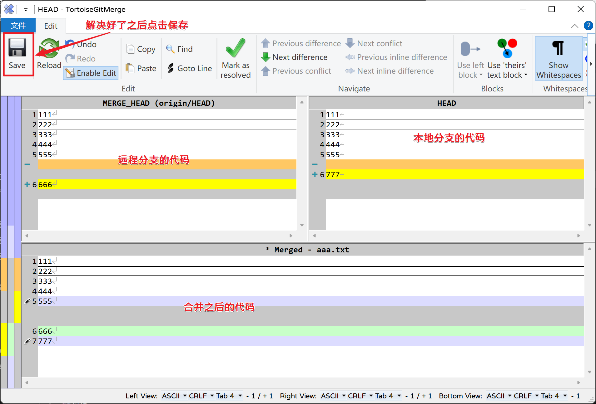 本次操作同样是产生了两个版本,一个是本身自己提交的666功能,另一个是合并远程仓库代码是产生冲突之后解决冲突生成的一个版本;