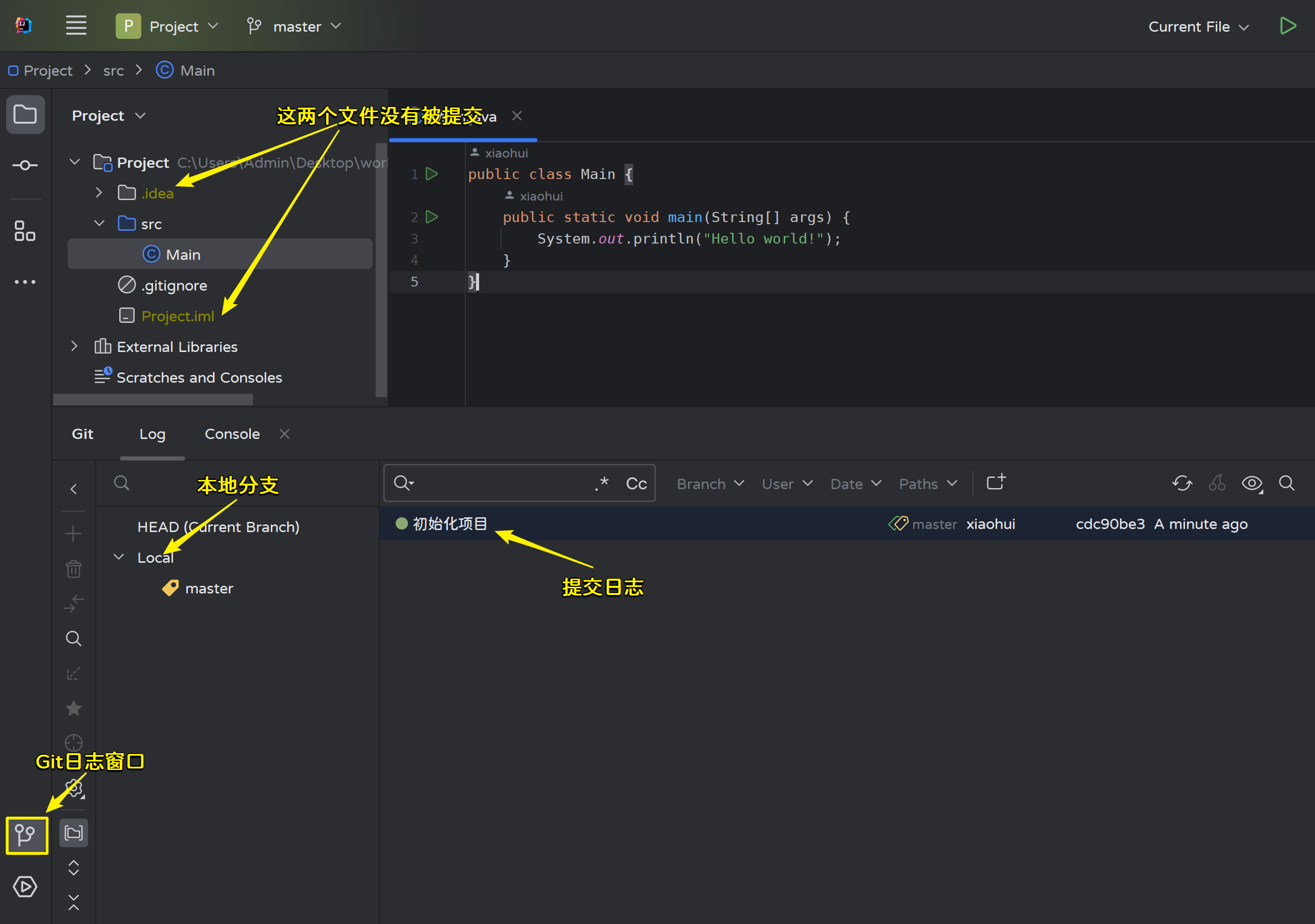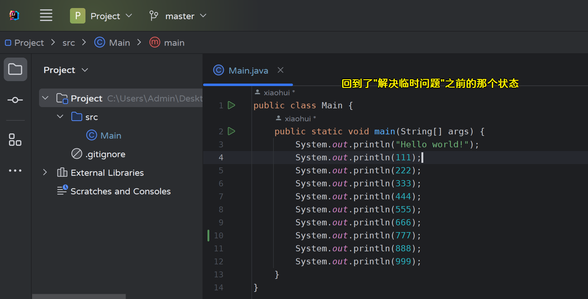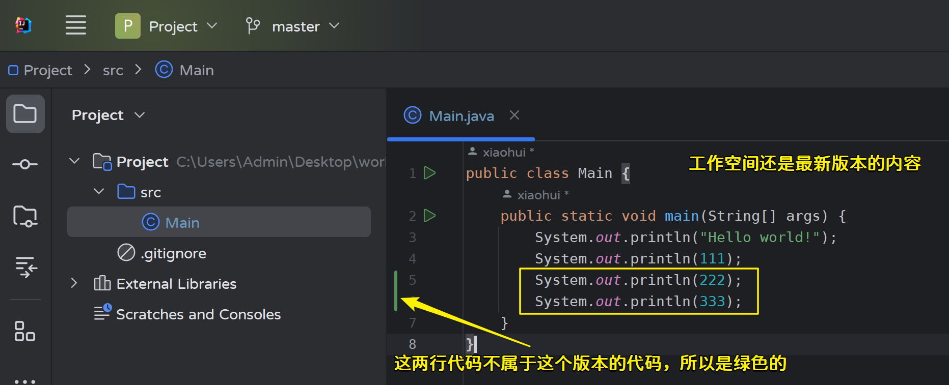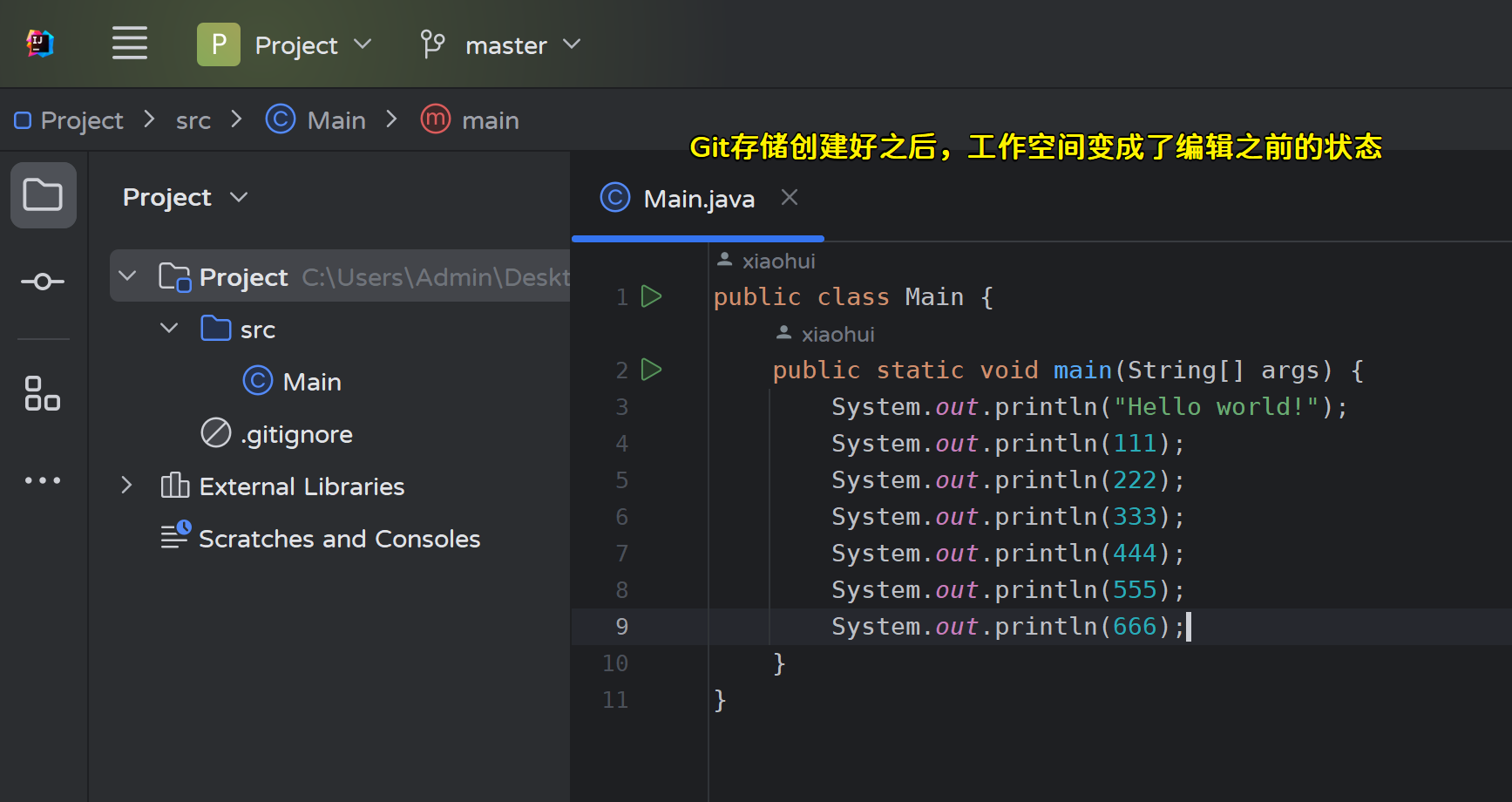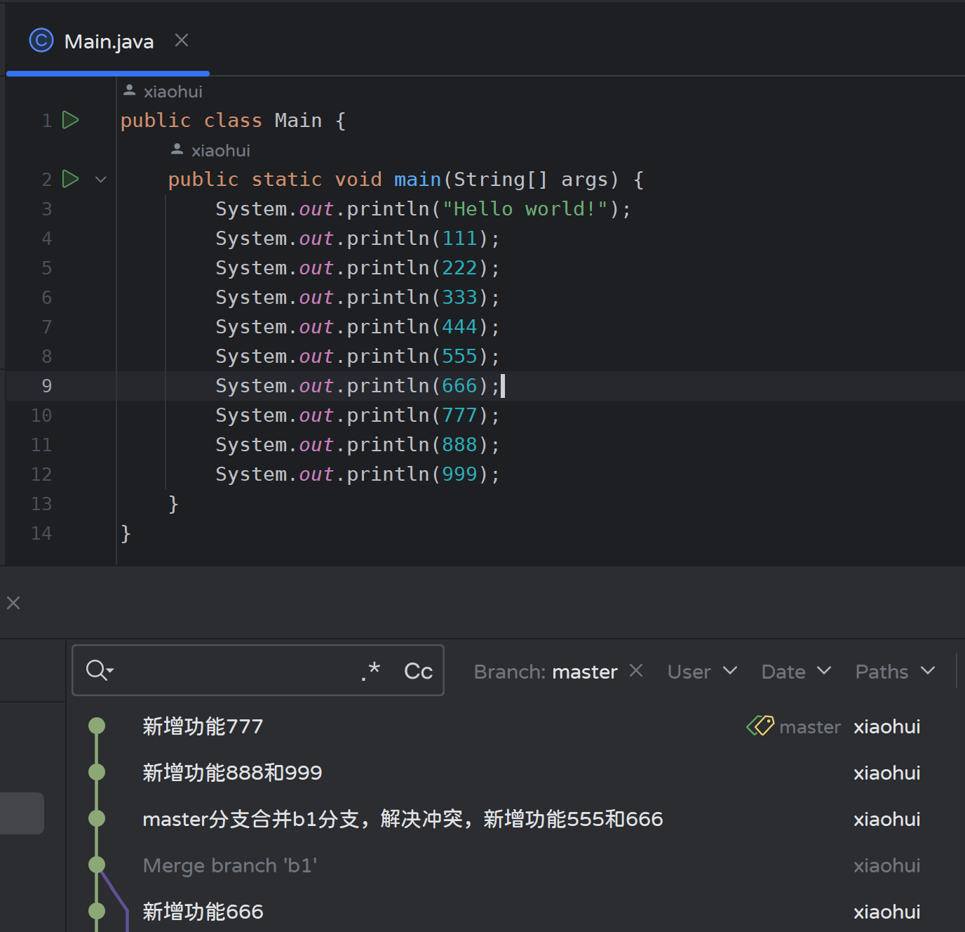- 修改master分支的Main.java文件,然后提交: