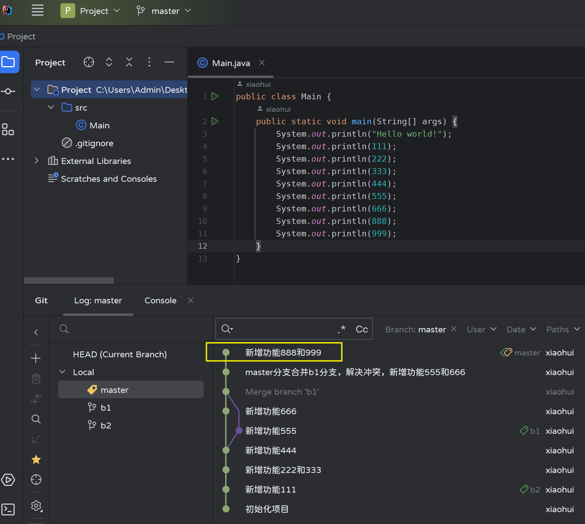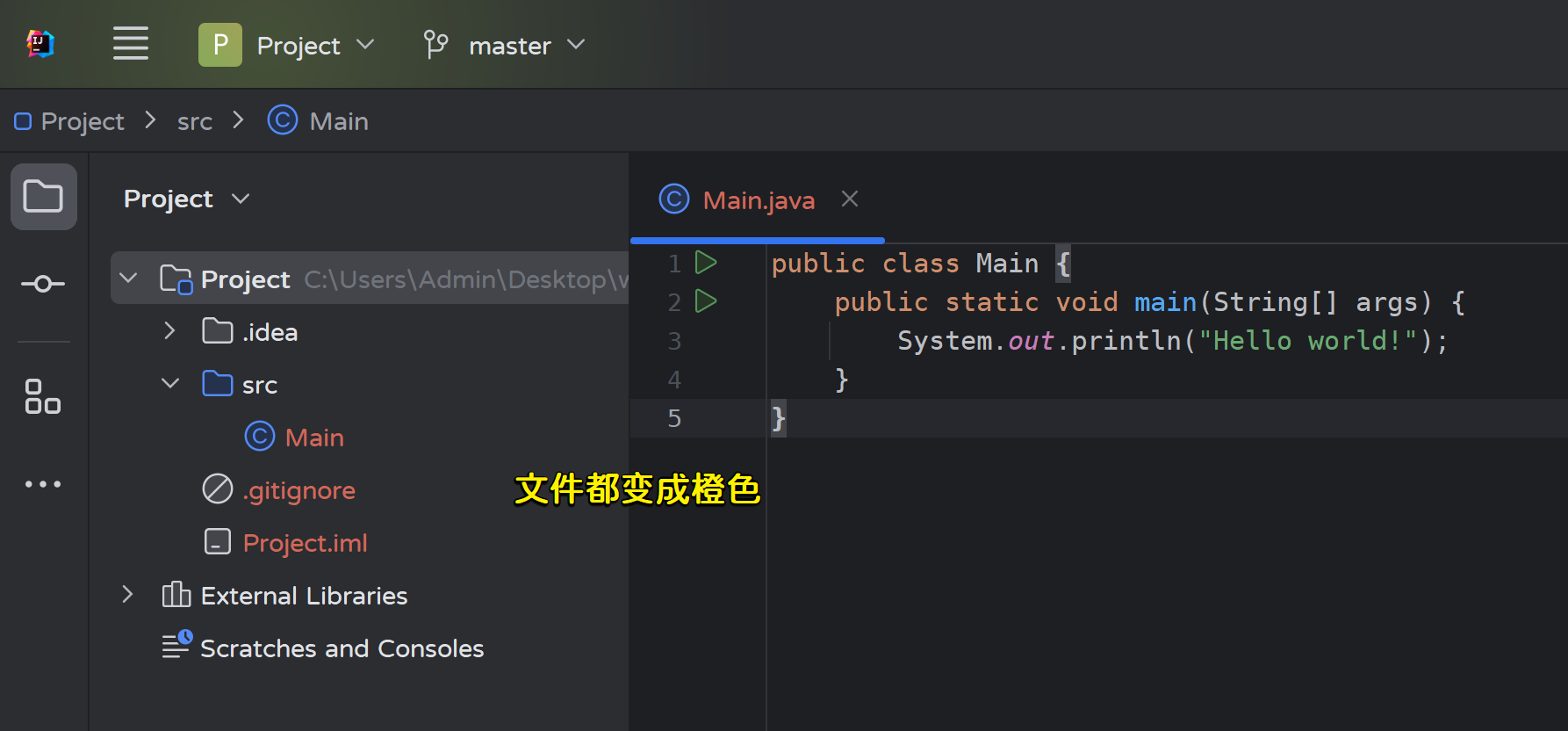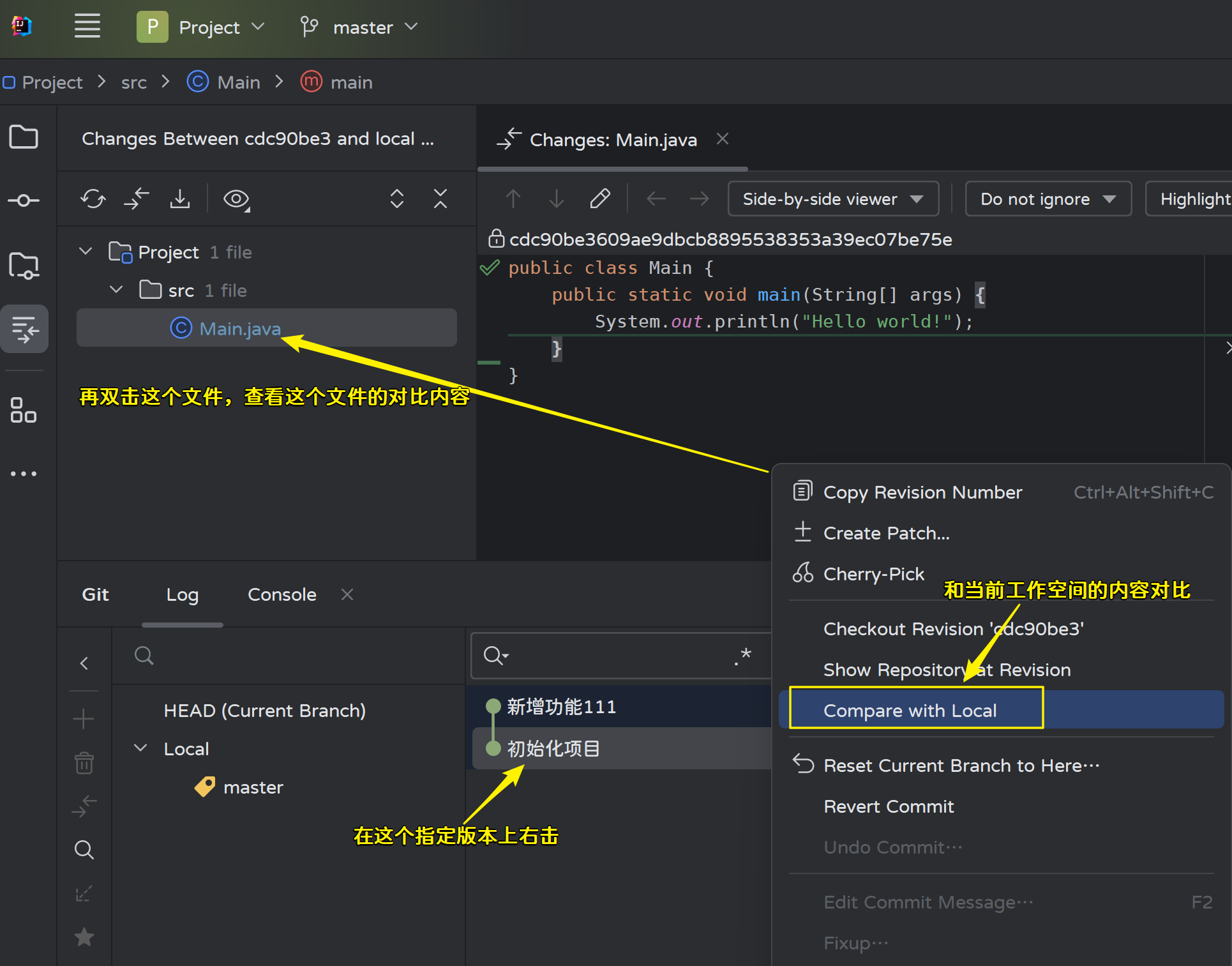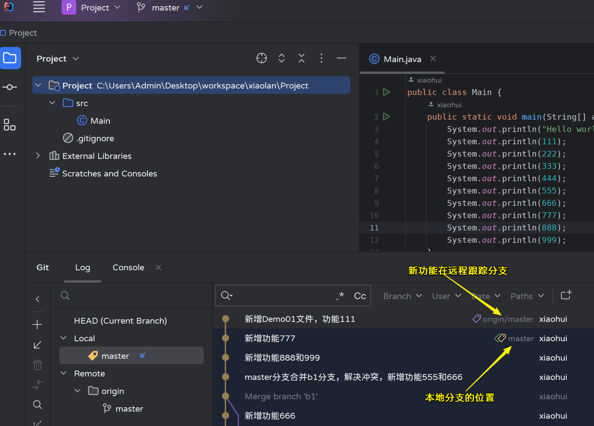 - 修改master分支的Main.java文件,然后提交: