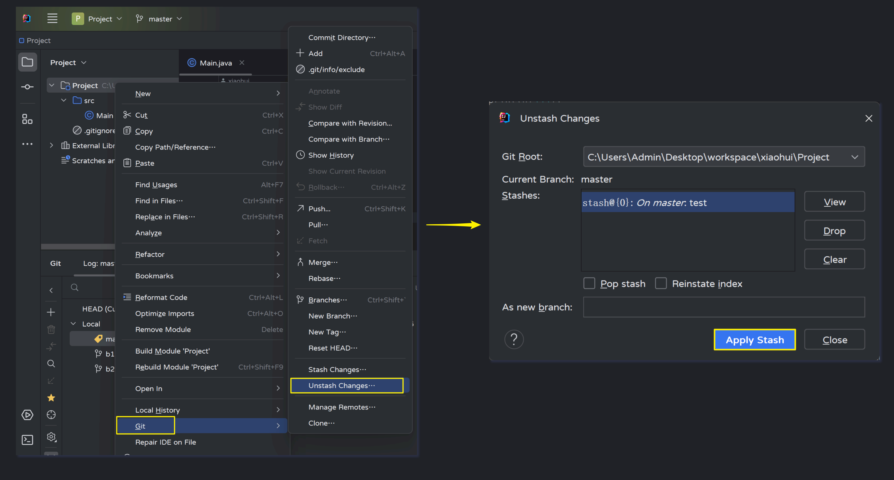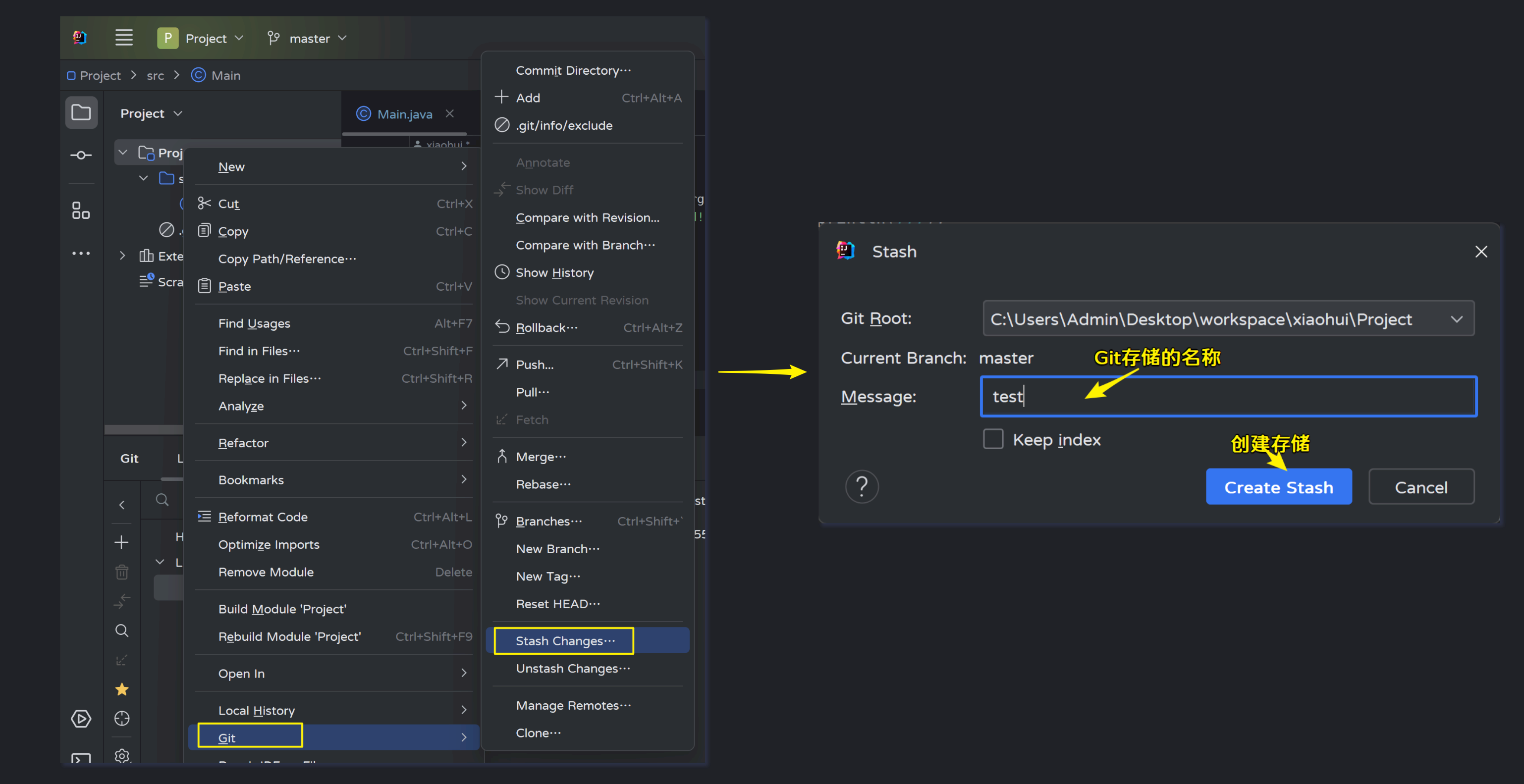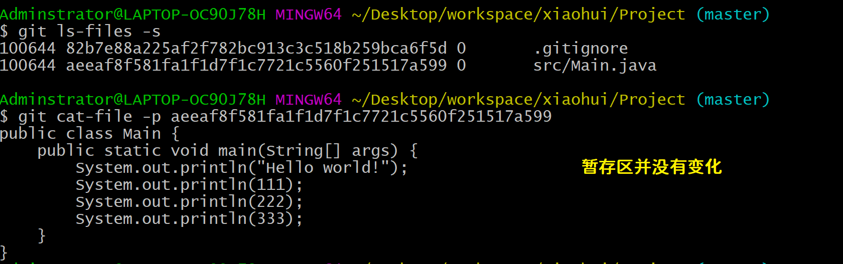 Adminstrator@LAPTOP-OC90J78H MINGW64 ~/Desktop/workspace/xiaohui/Project (master) # 暂存区的内容变化了
