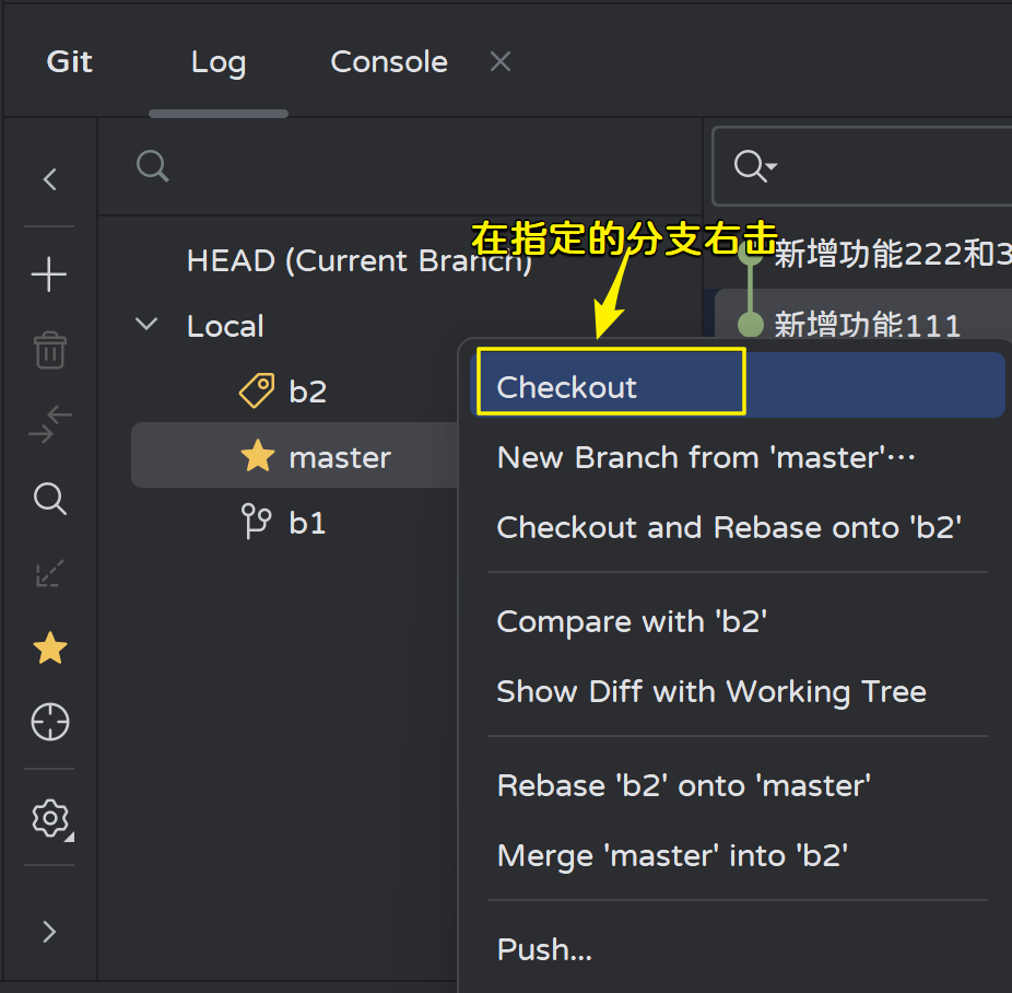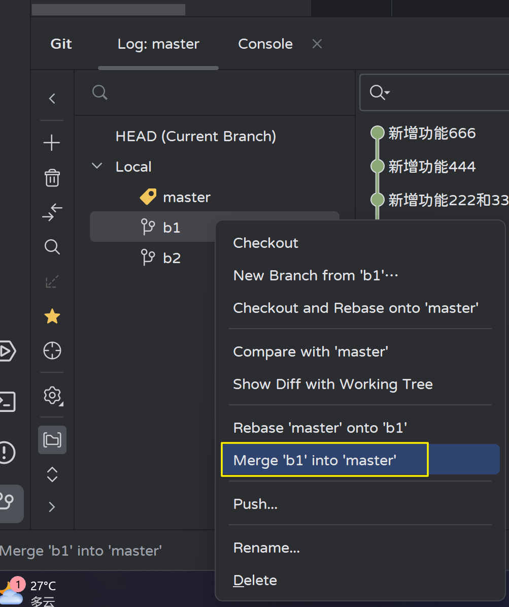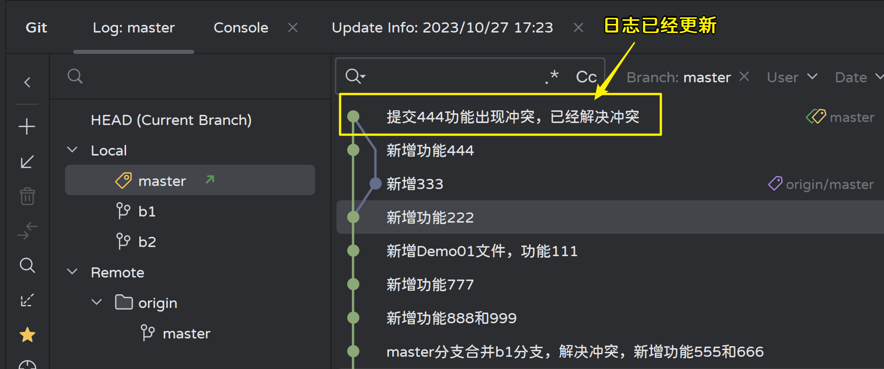 切换到b1分支,合并master分支的内容: