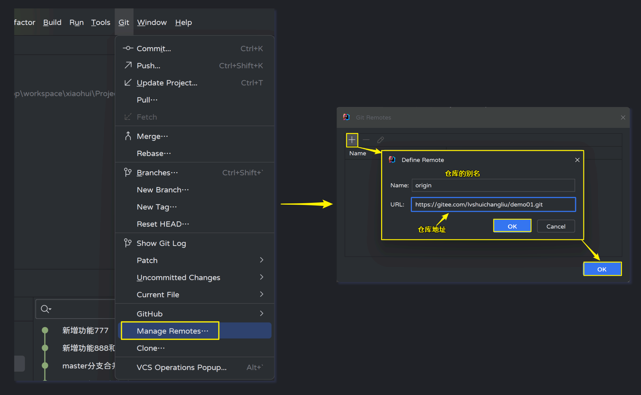 打开菜单栏中的Git--->Manage Remotes: