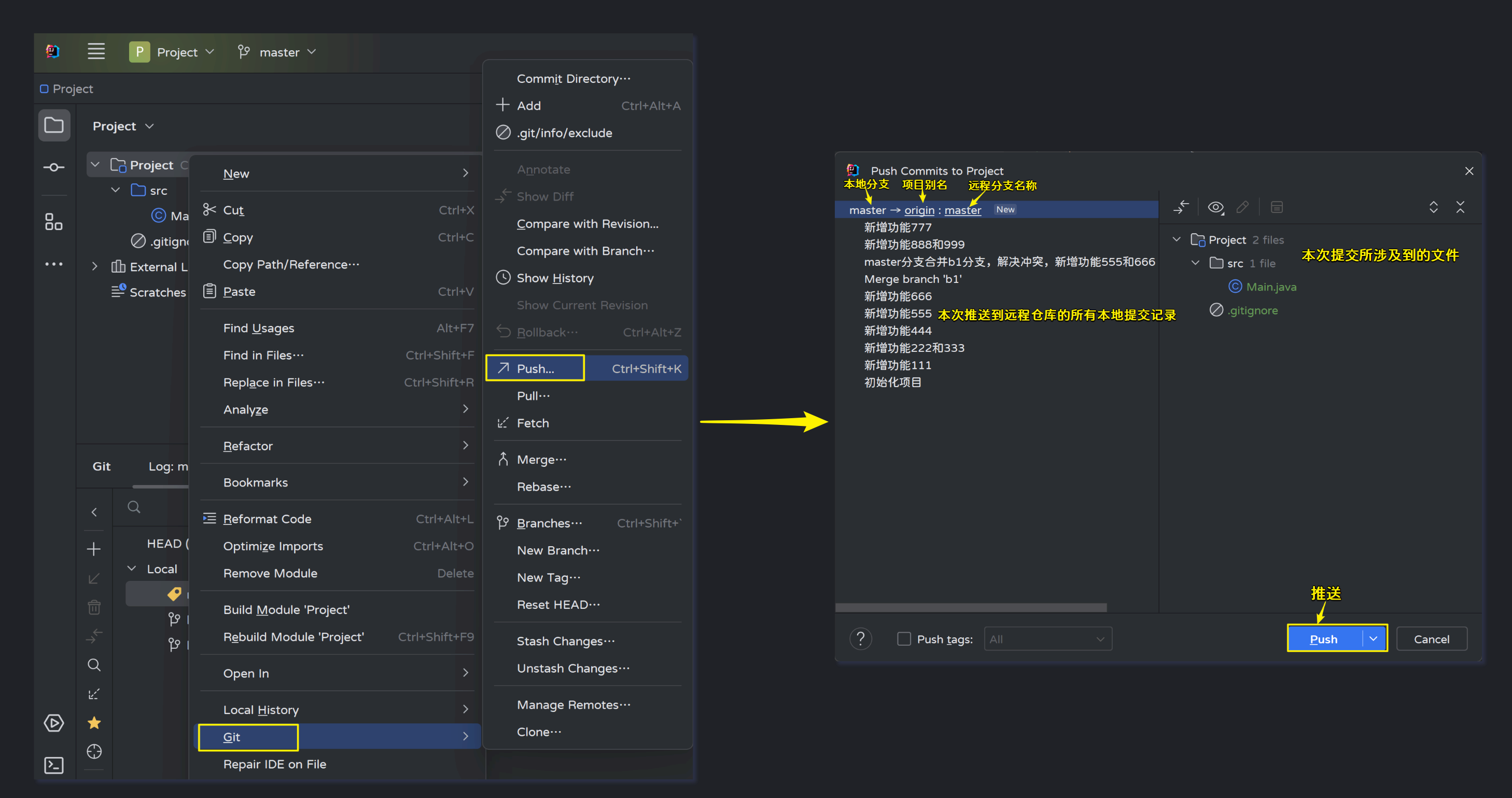 在项目上右击--->Git--->Push...: