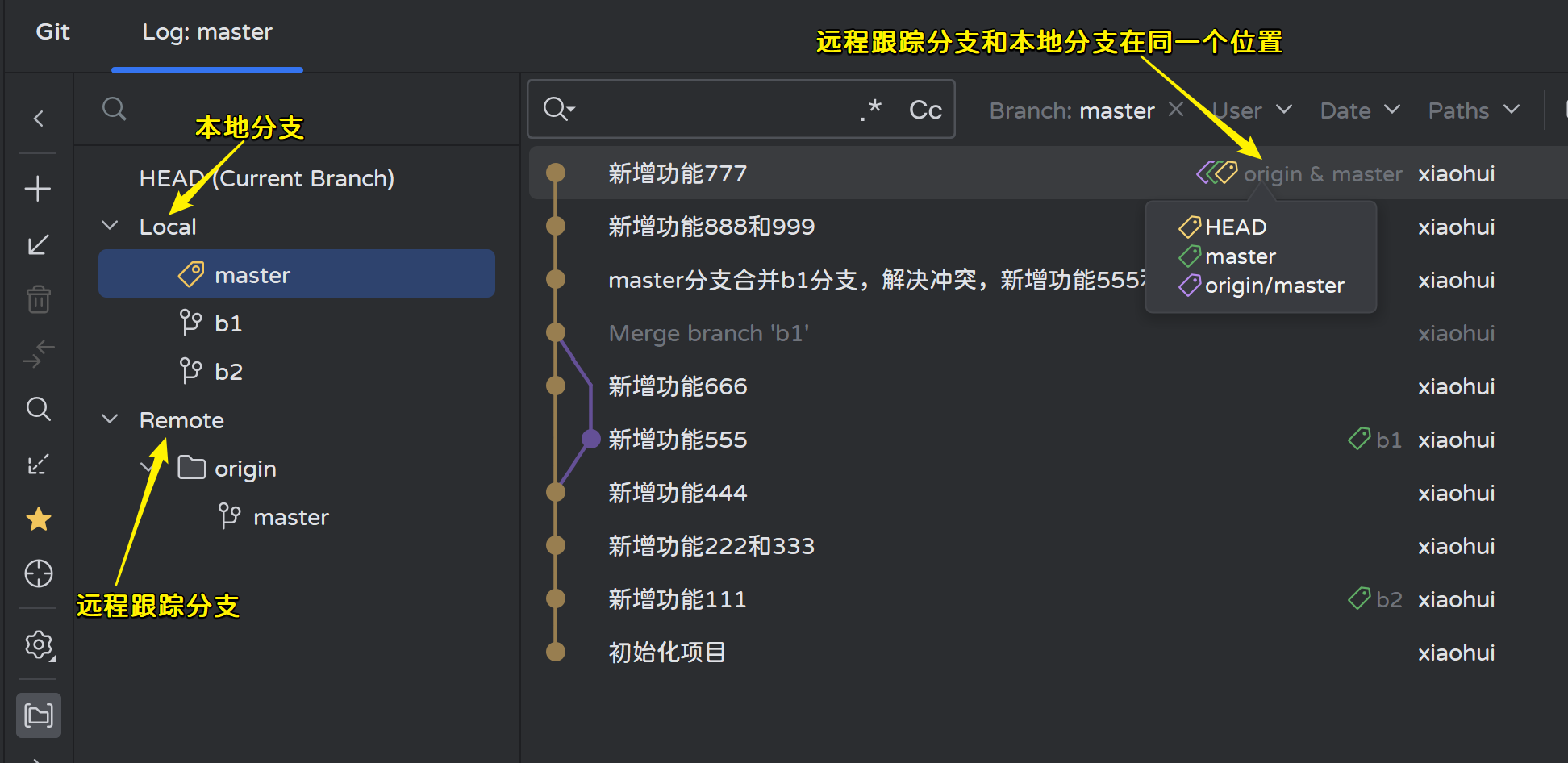 推送成功后,查看Git日志,发现master的远程跟踪分支创建成功: