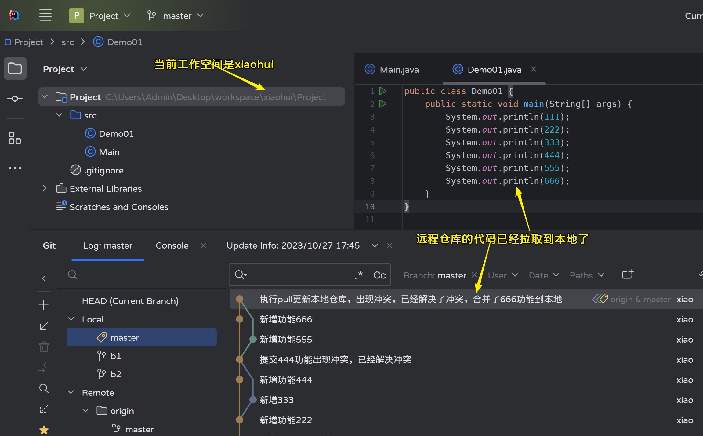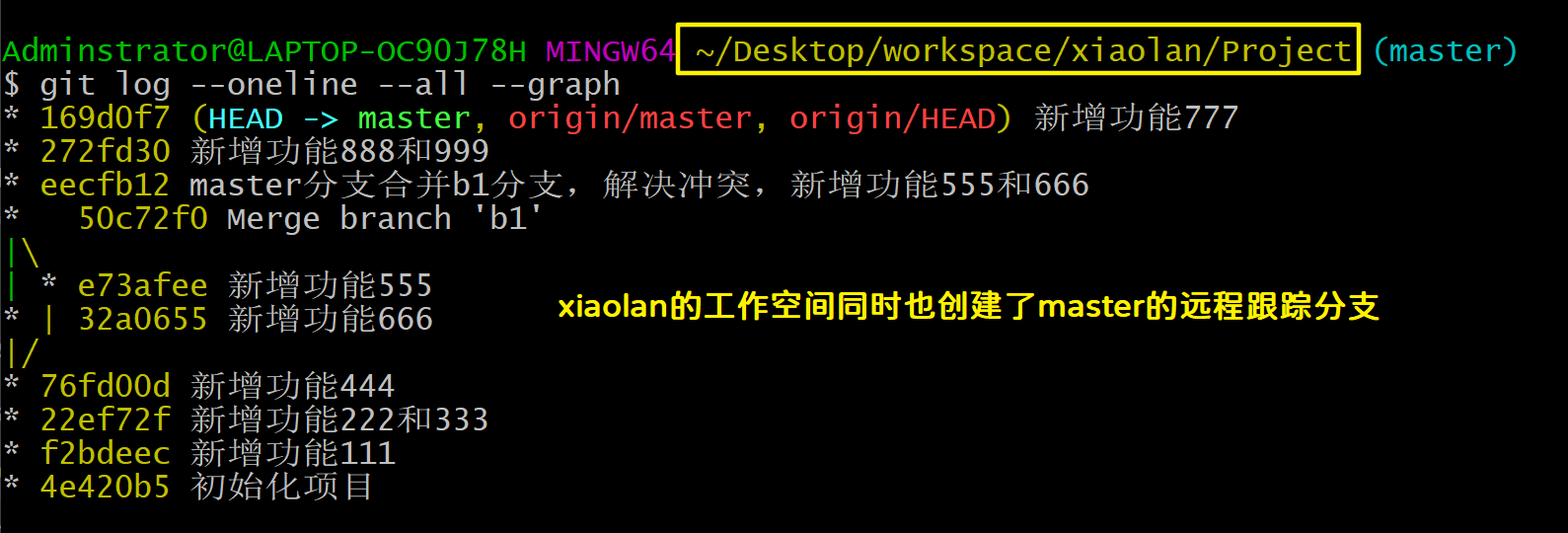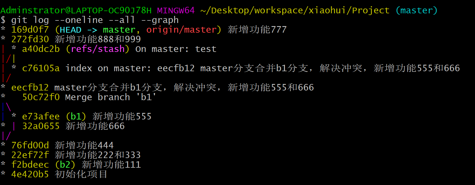 Adminstrator@LAPTOP-OC90J78H MINGW64 ~/Desktop/workspace/xiaohui/Project (master) # 工作空间变化了