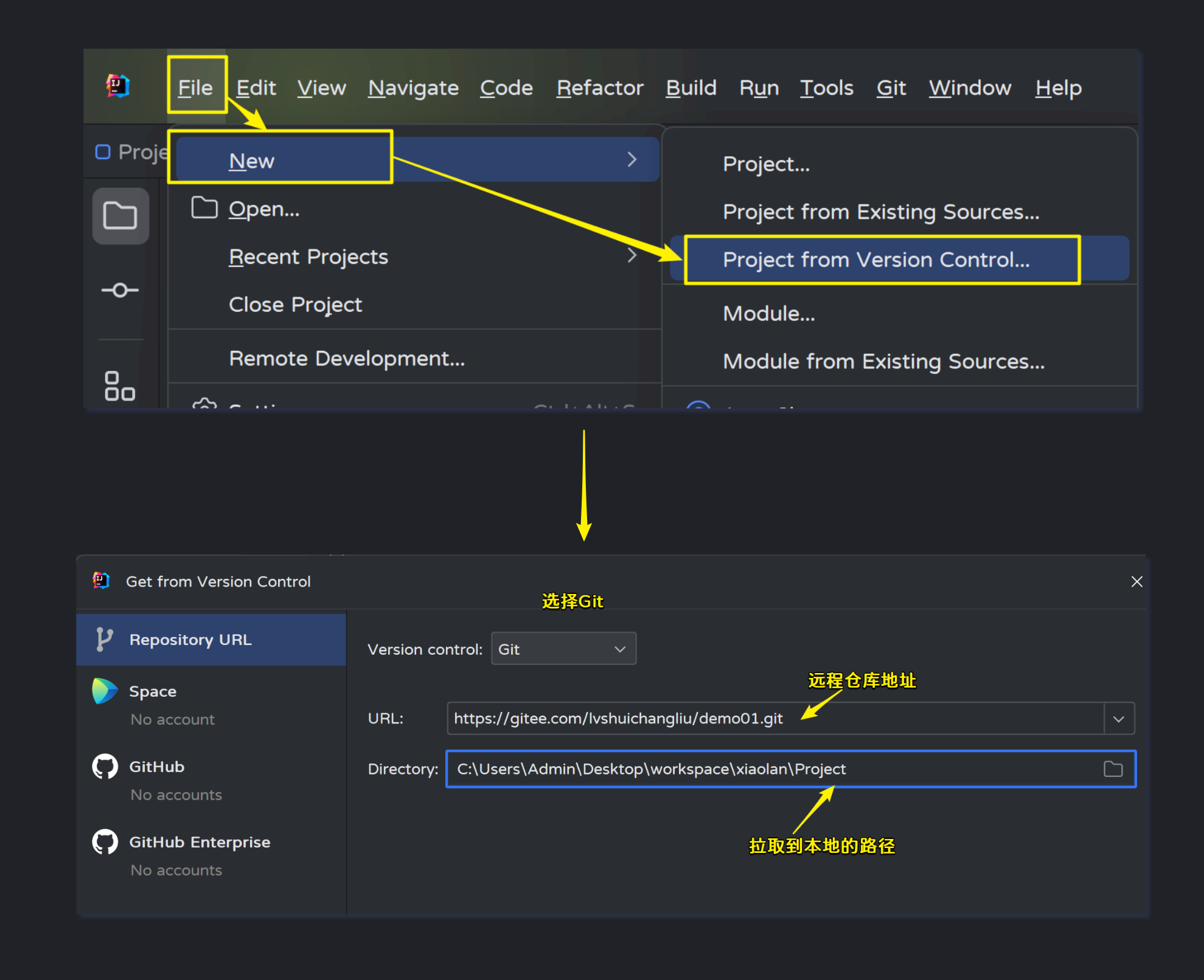 点击菜单栏上的File--->New--->Project from Version Control...: