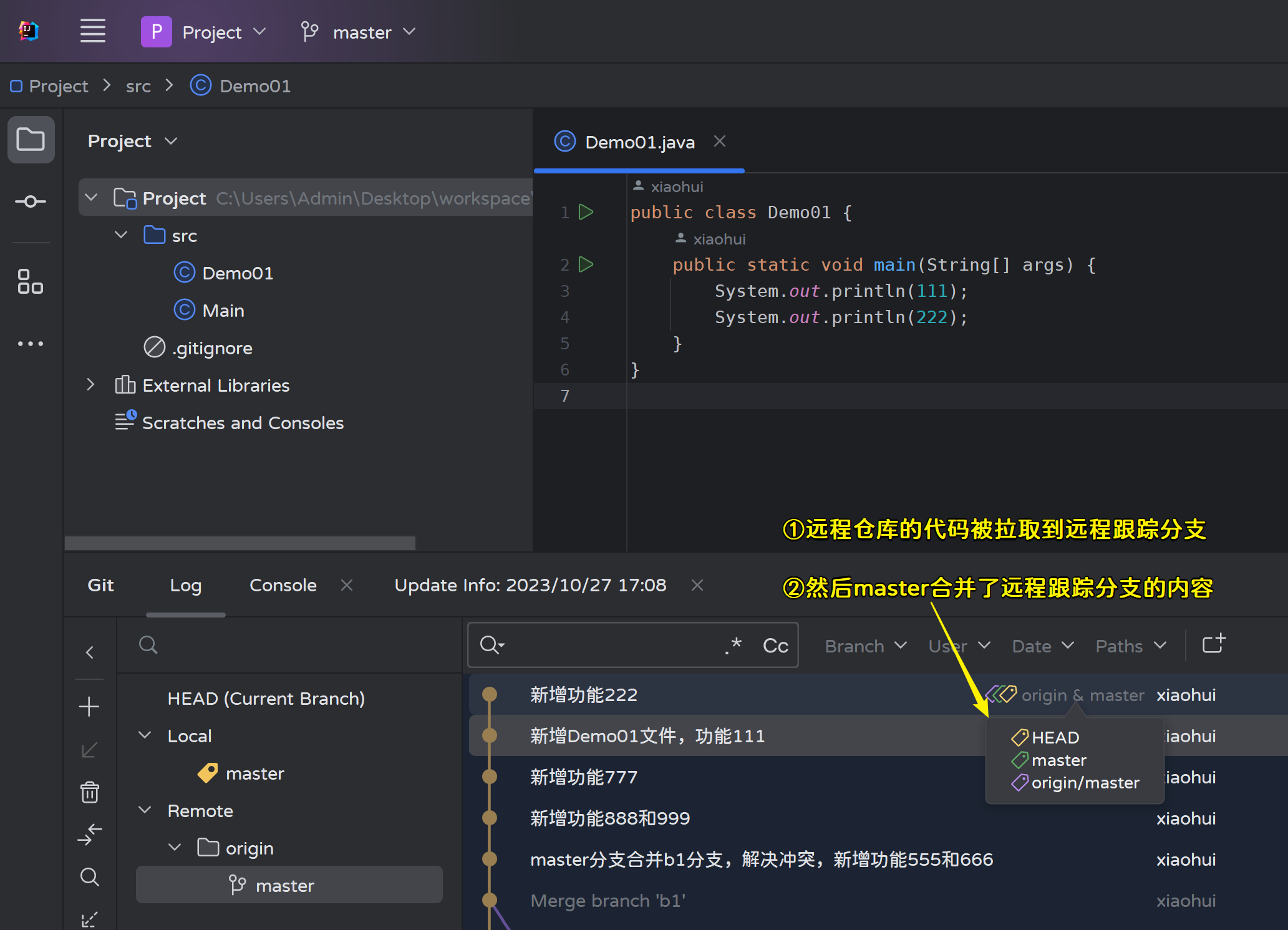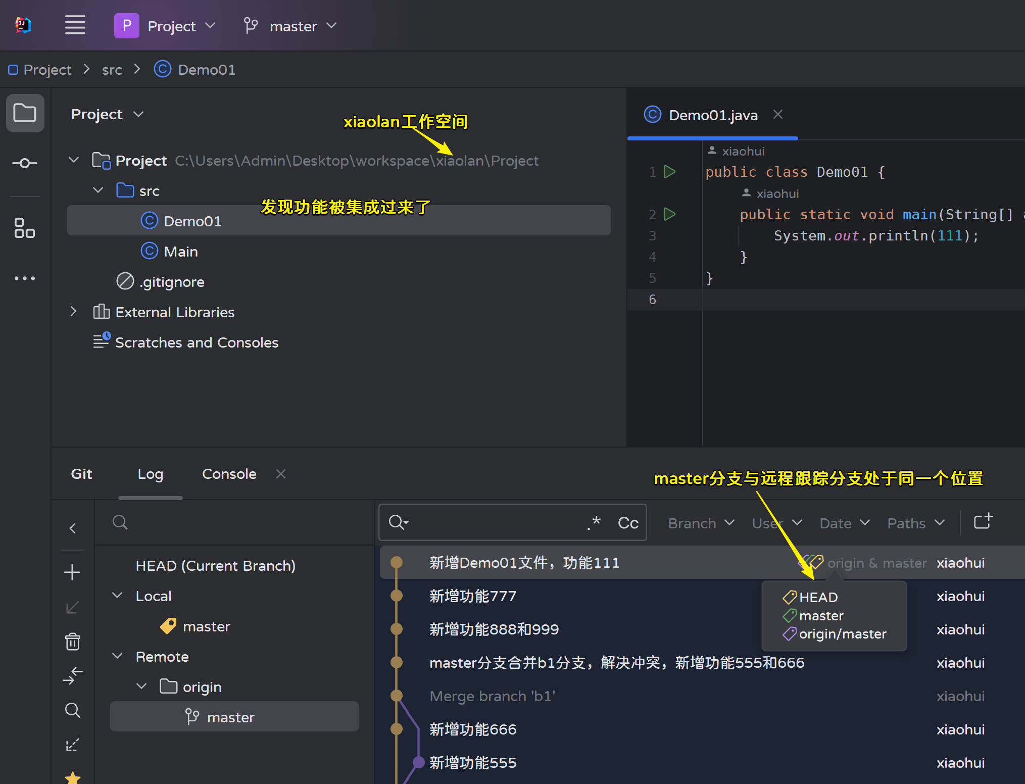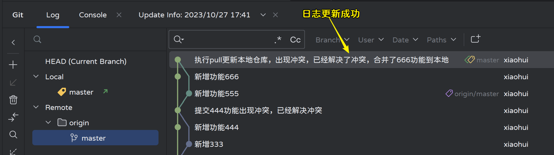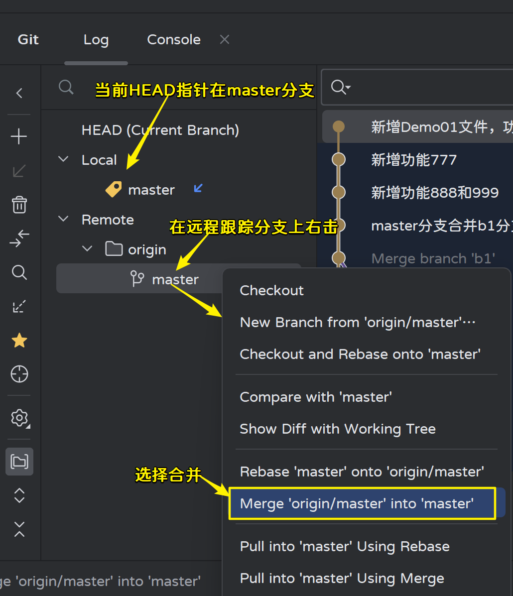 查看Git日志,新功能在远程跟踪分支origin/master上,本地分支还在之前的位置: