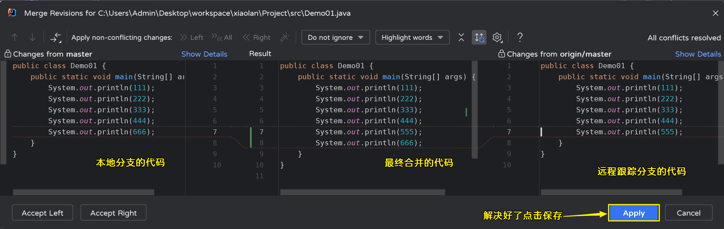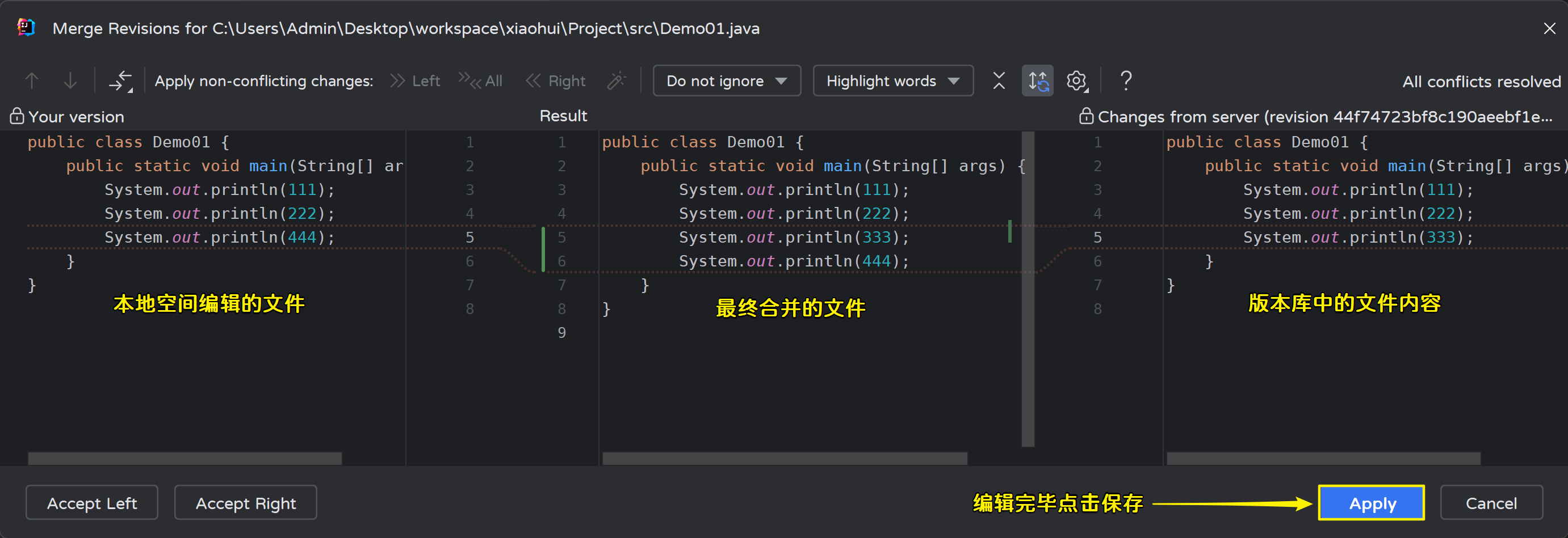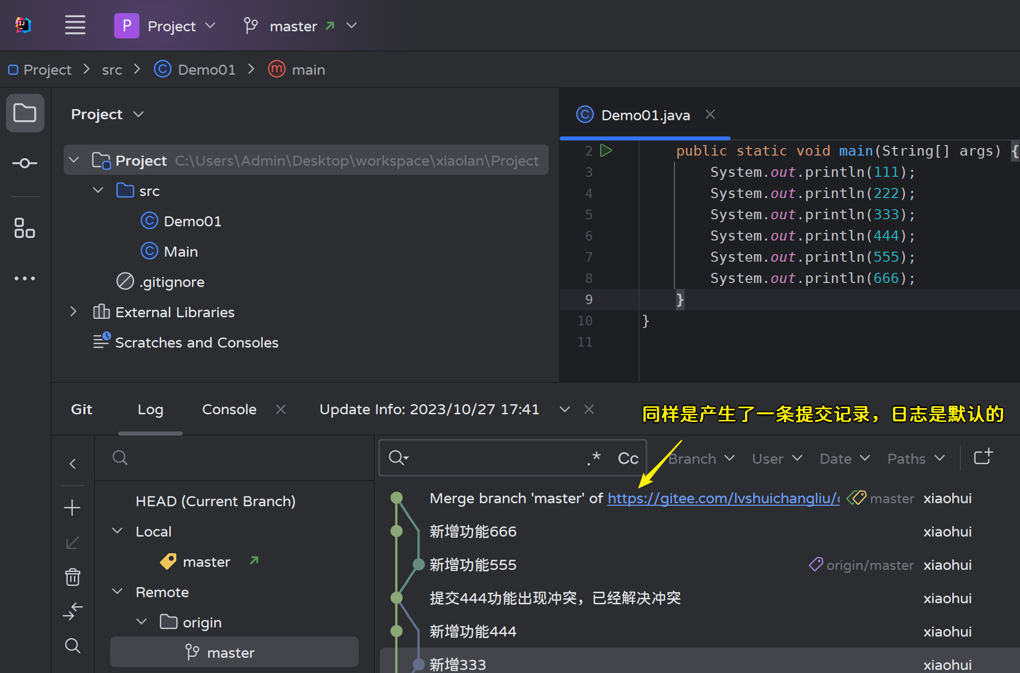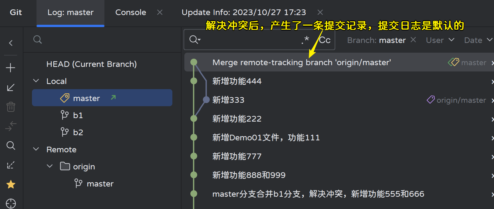 解决冲突之后,和之前一样还是产生了一条新的提交记录,提交日志是默认的: