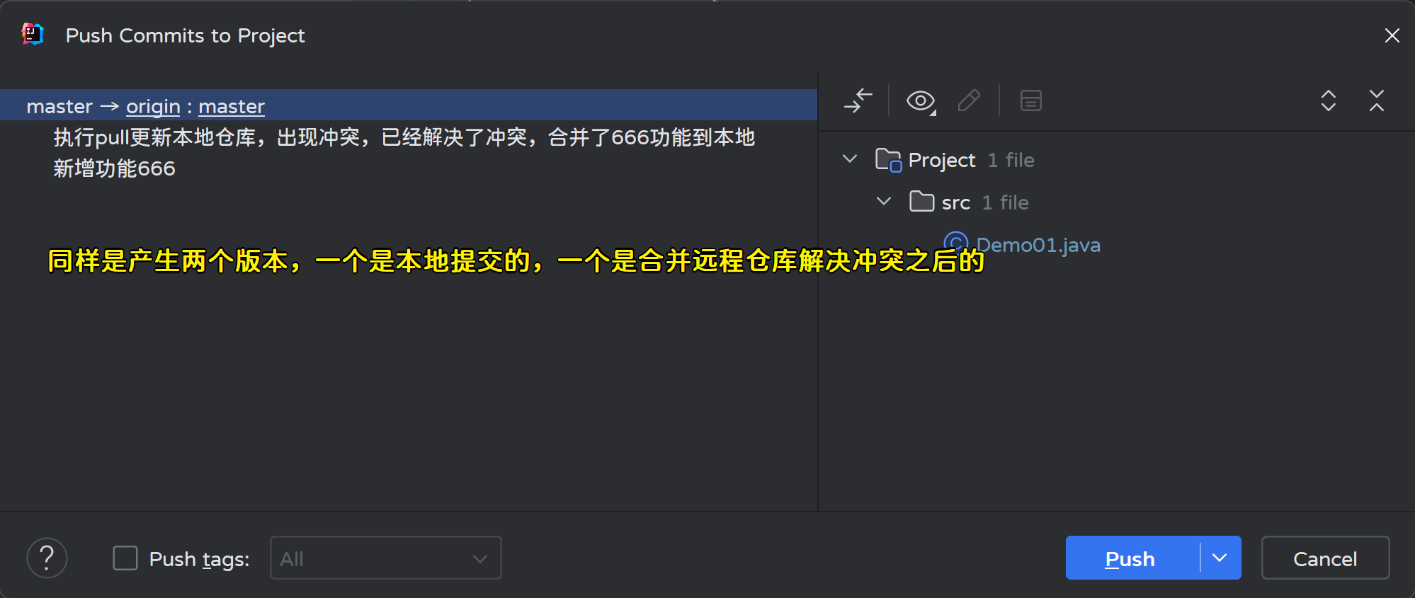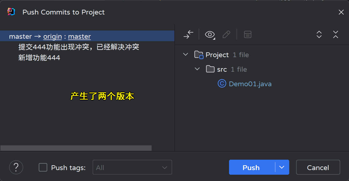 Tips:在使用Git原始命令时,如果本地仓库的版本不是最新版本则不允许执行push,但IDEA做了优化,本地仓库即使不是最新版本也允许提交,但可能会出现冲突;