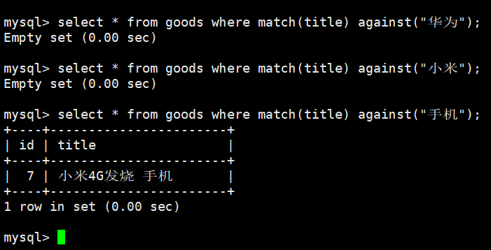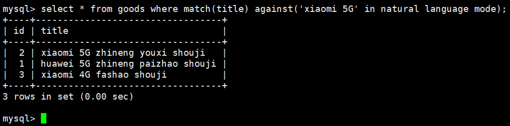 select * from goods where match(title) against('xiaomi 5G'); -- 简写