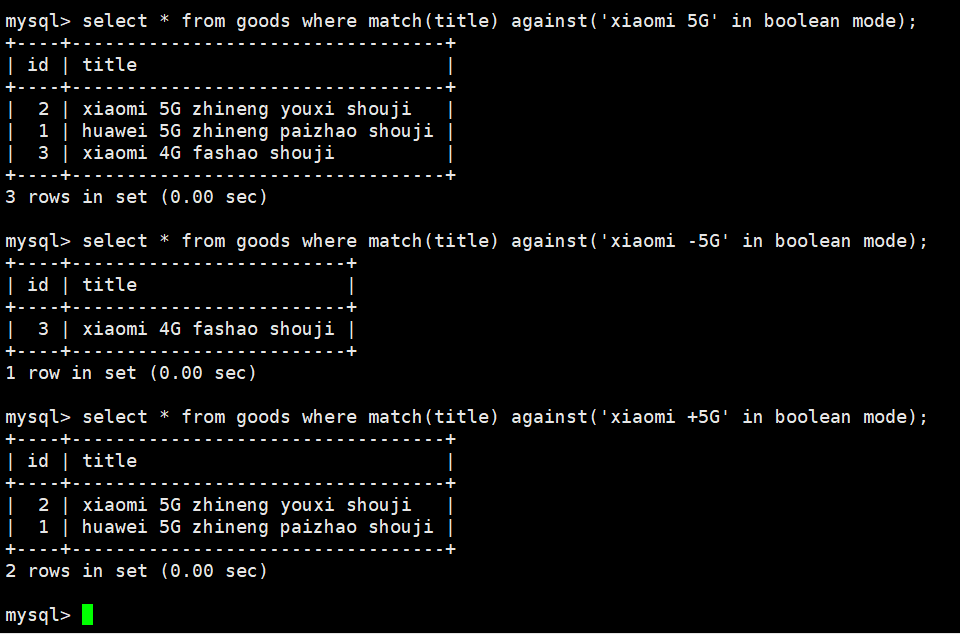 select * from goods where match(title) against('xiaomi -5G' in boolean mode);