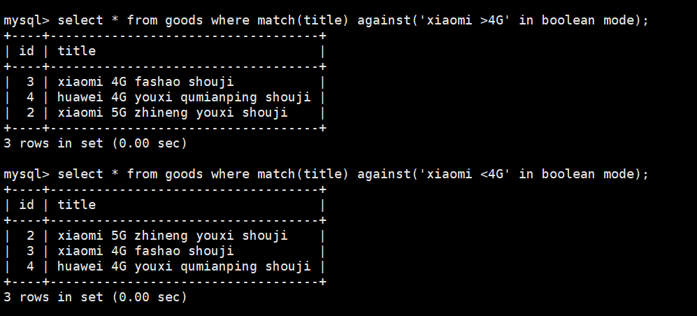 select * from goods where match(title) against('xiaomi <4G' in boolean mode);