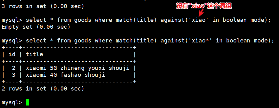 select * from goods where match(title) against('xiao*' in boolean mode);