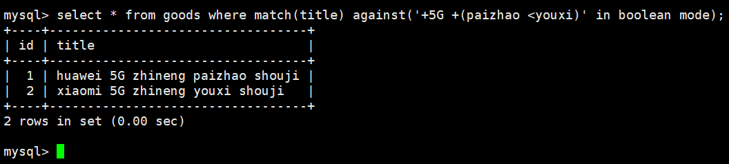select * from goods where match(title) against('+5G +(paizhao <youxi)' in boolean mode);