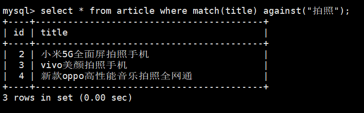 select * from article where match(title) against("拍照");