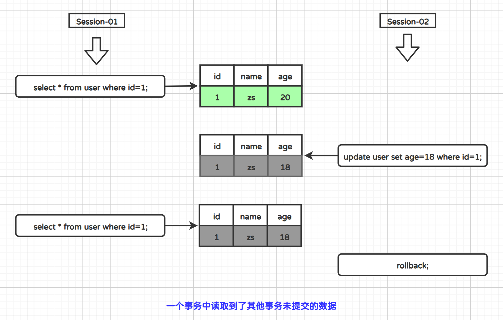 - 脏读: 一个事务(用户)读取到了另一个事务没有提交的数据