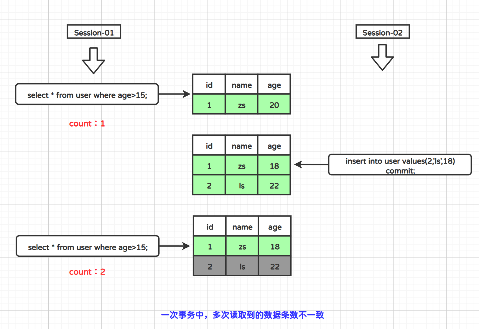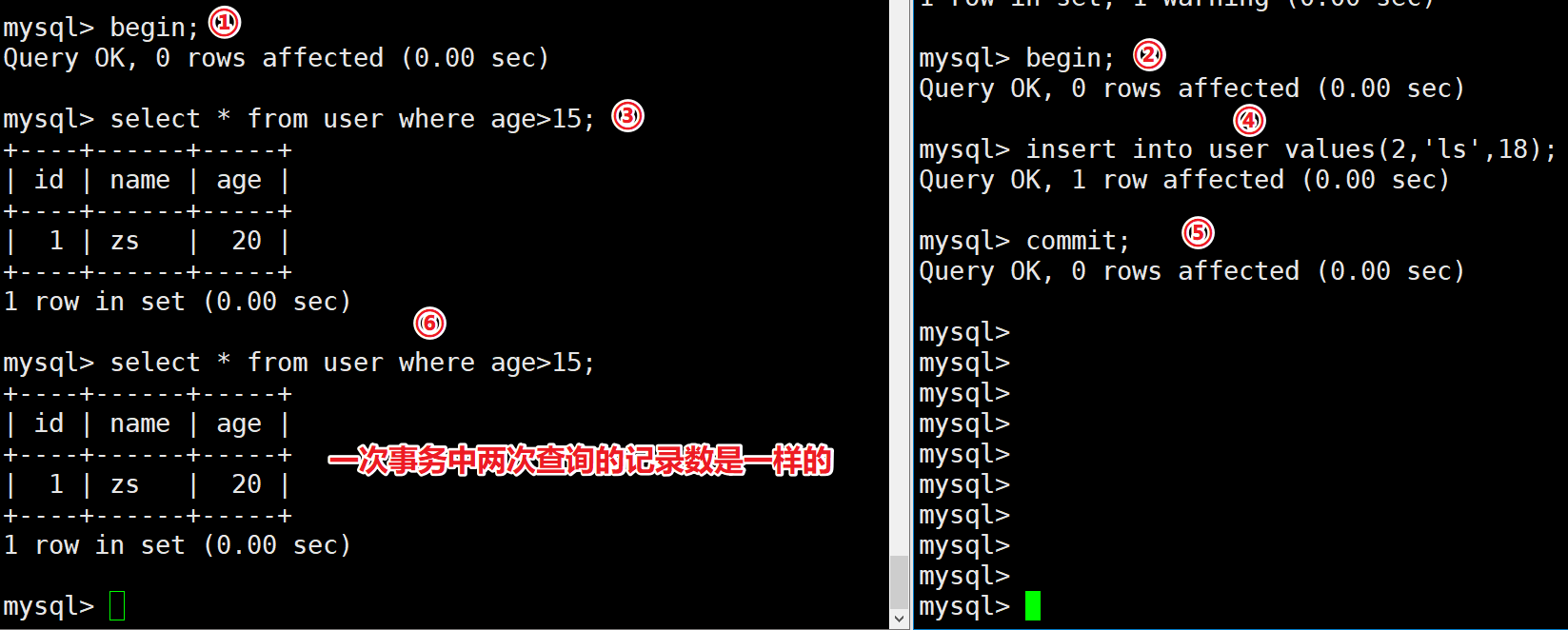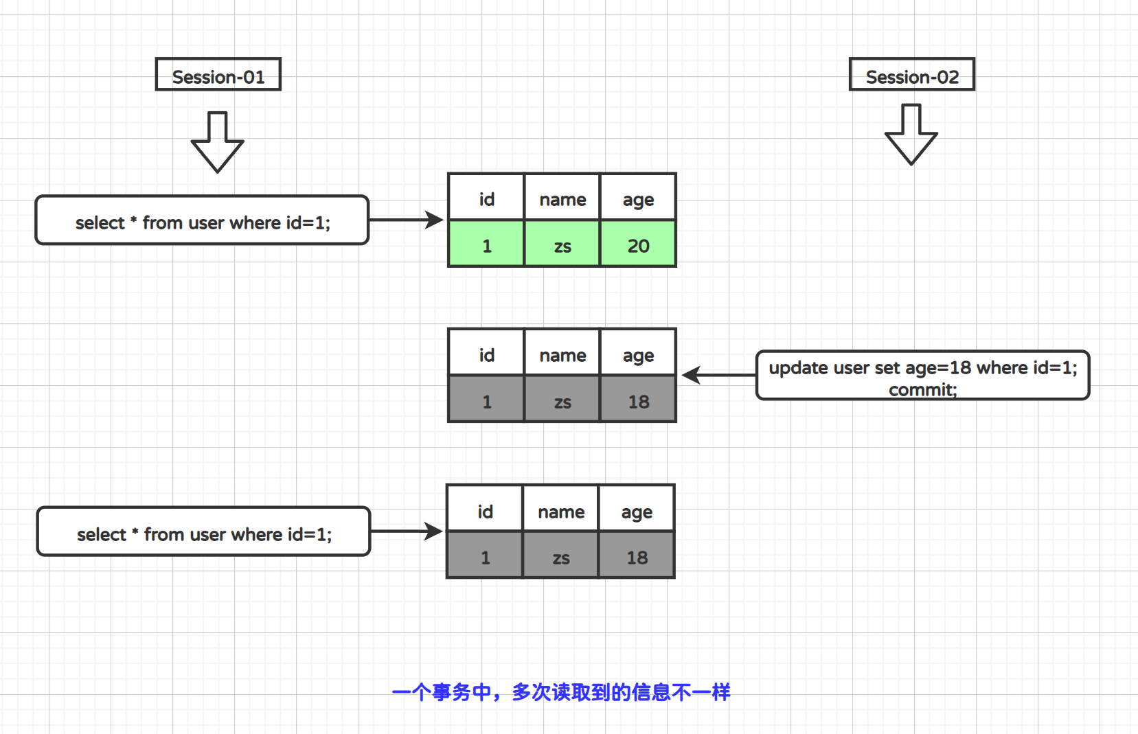 在上面案例中,session-01窗口两次查询id=1的数据都不一致。