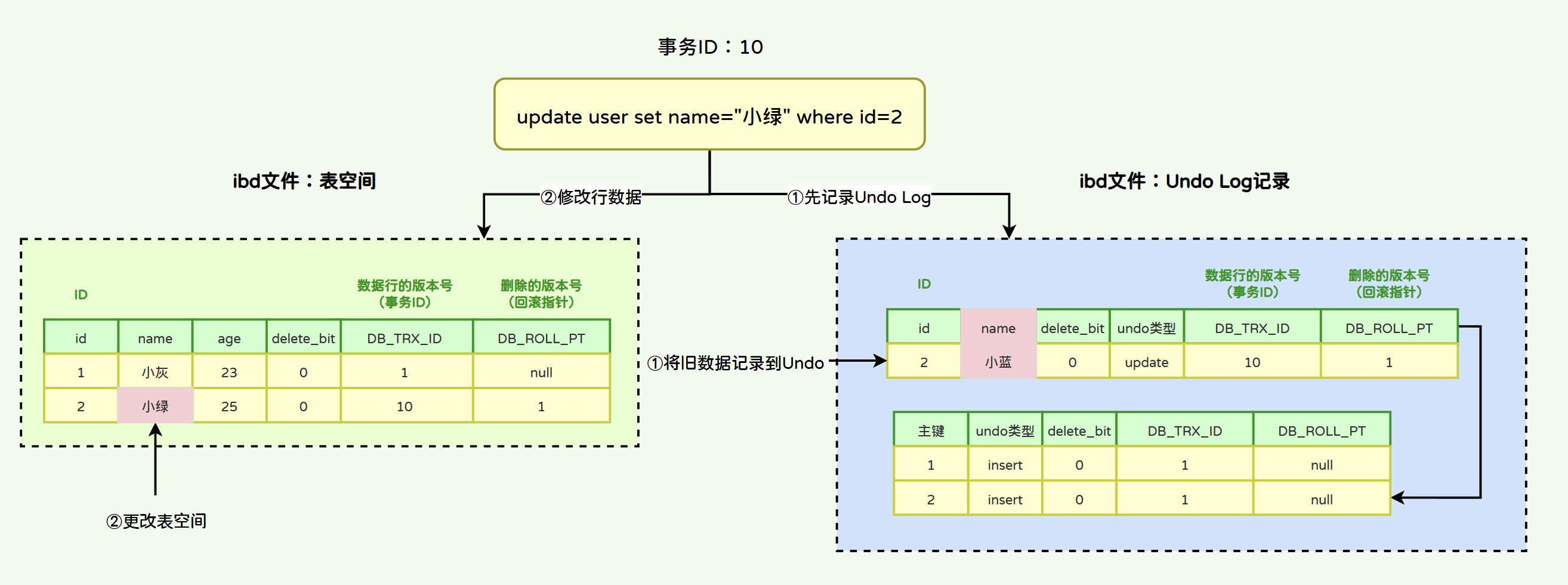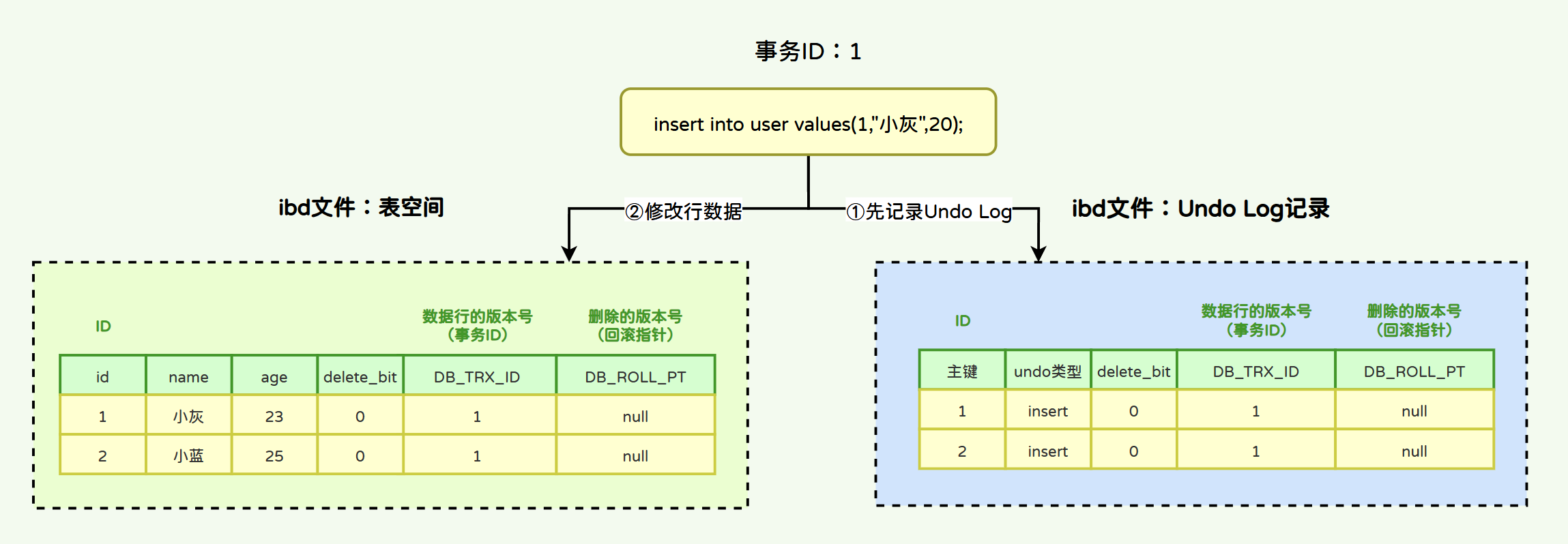 T2:执行了insert语句,分配了事务ID为58168(小绿的事务ID)。