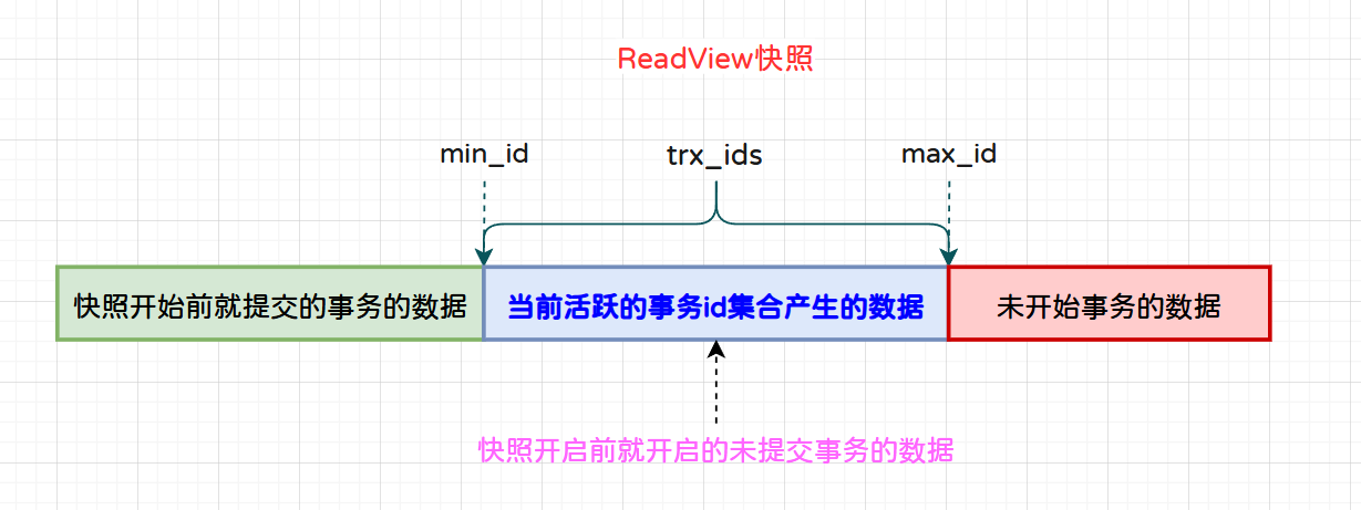 在T2时刻执行了查询,拍下了一致性快照ReadView,当前快照中把小蓝的事务ID定义为活跃事务id,即存储在trx_ids集合中。