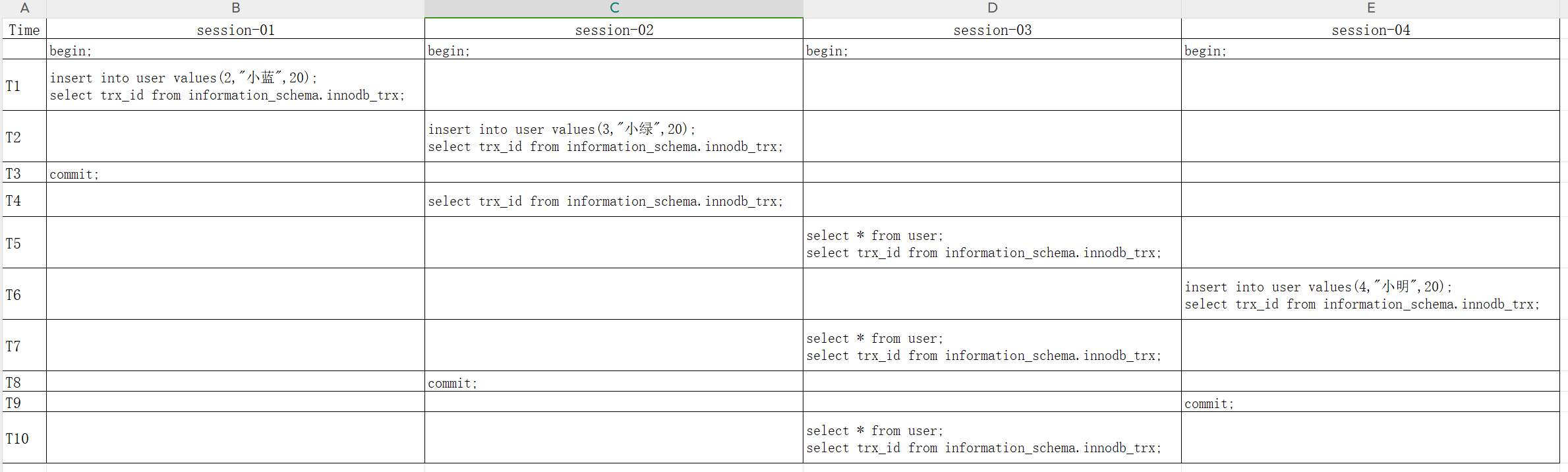 | T5 | -- 执行insert,分配非只读事务id insert into user values(3,"小绿",20); -- 查询事务id select trx_id from information_schema.innodb_trx; | ||