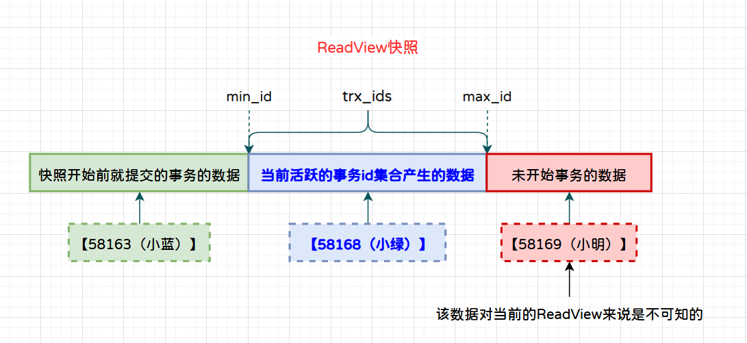 T5:拍下一致性快照,当前的快照中将58168(小绿)定义为活跃事务id,并且58163(小蓝)则不在trx_ids集合中,属于快照拍下前就提交的事务产生的数据,这条数据(小蓝)对于当前快照来说是可见的。