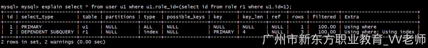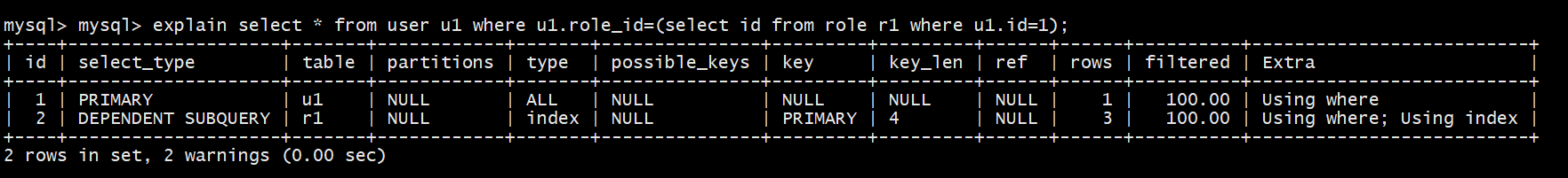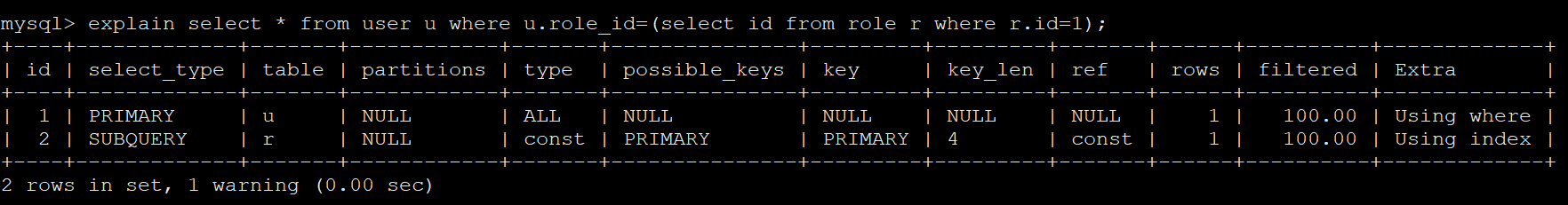 explain select * from user u1 where u1.role_id=(select id from role r1 where u1.id=1);