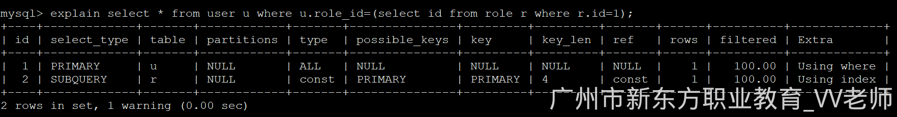 explain select * from user u where u.role_id=(select id from role r where r.id=1);