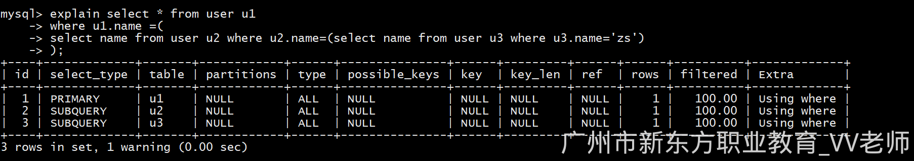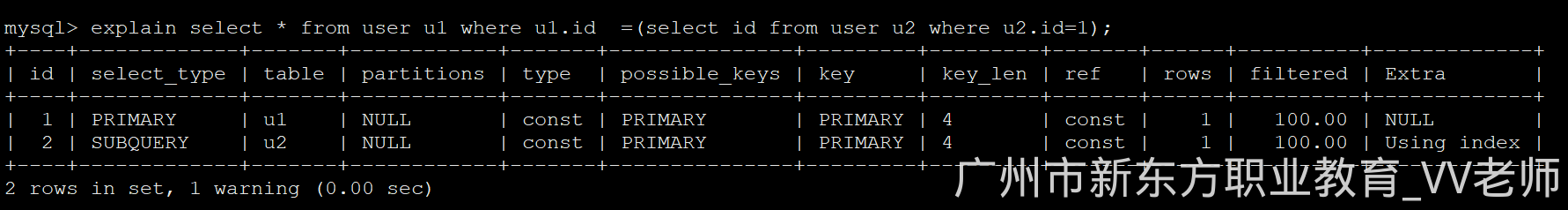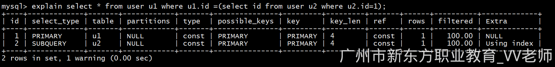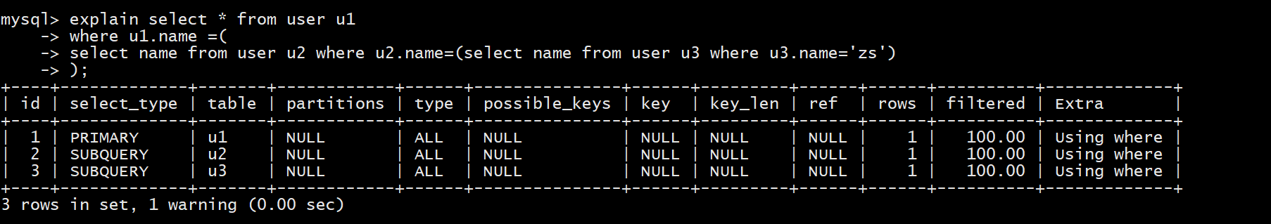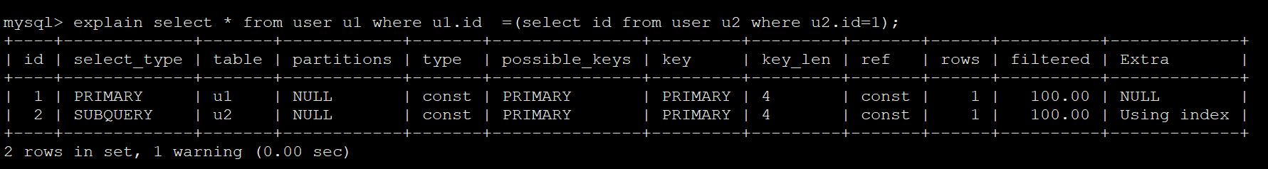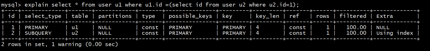 explain select * from user u1 where u1.id =(select id from user u2 where u2.id=1);