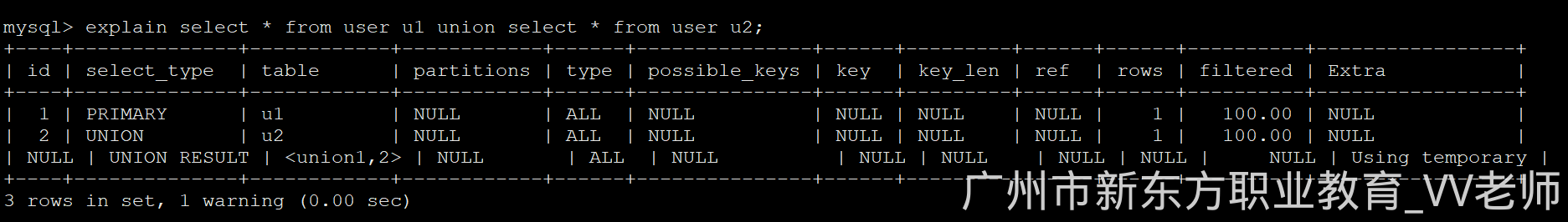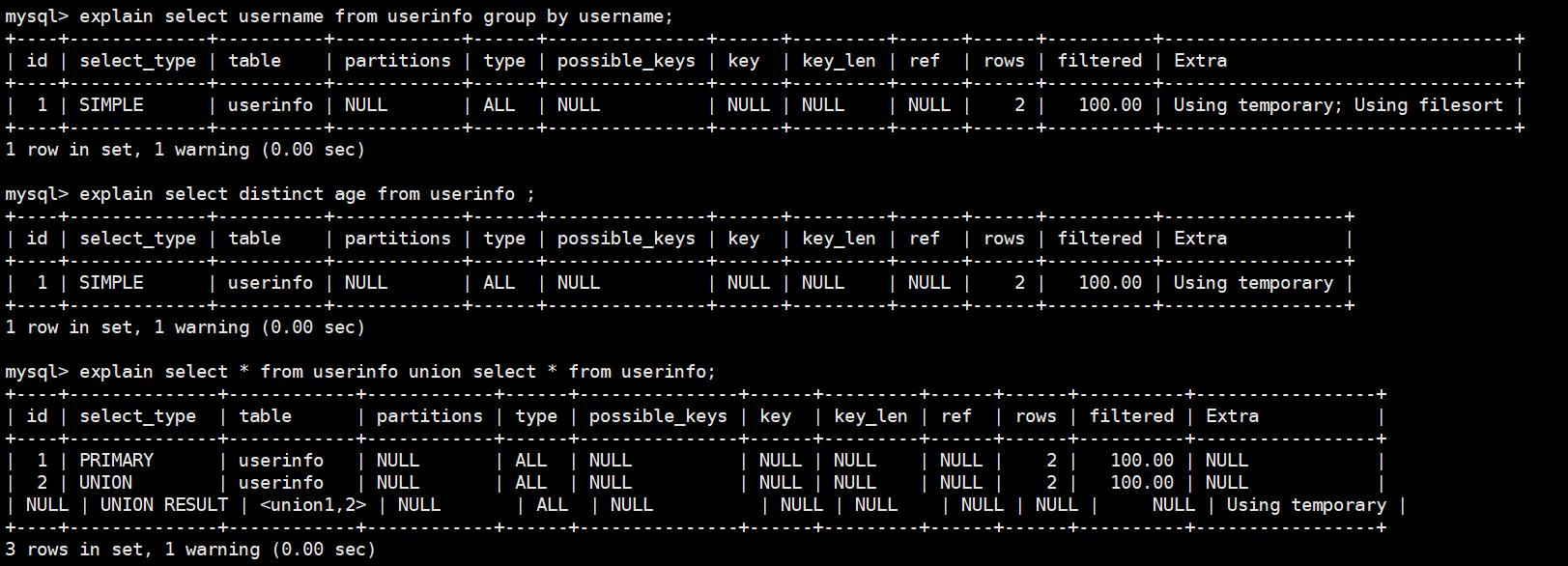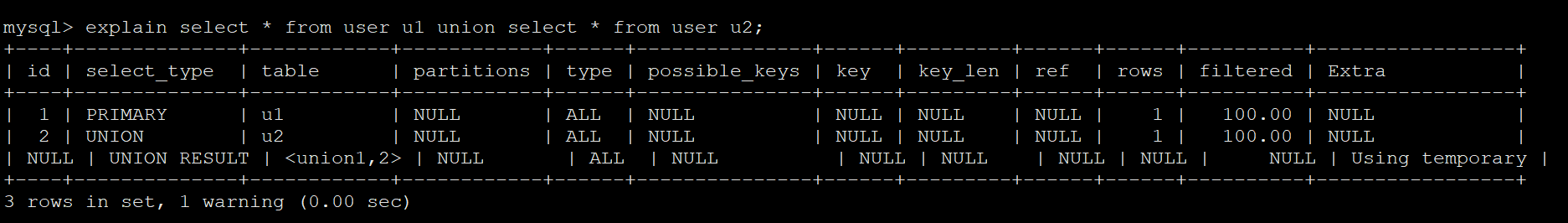 explain select * from user u1 union select * from user u2;