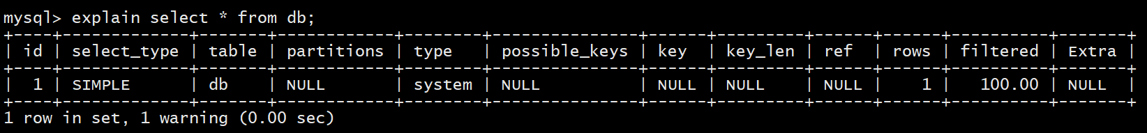- system:表中只有一条记录,并且此表为系统表(一般很少出现),const类型的特例;