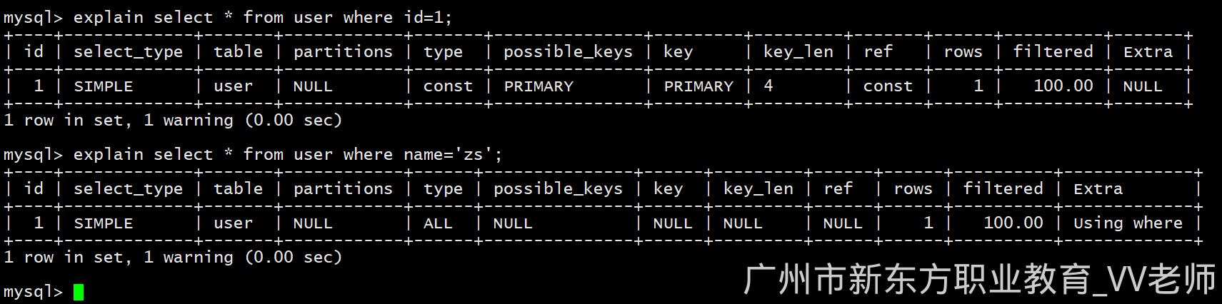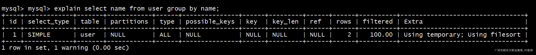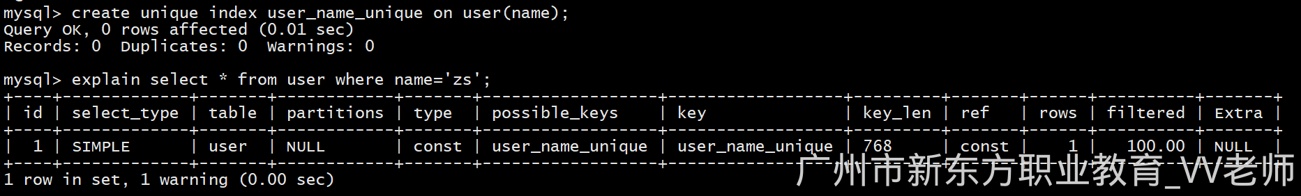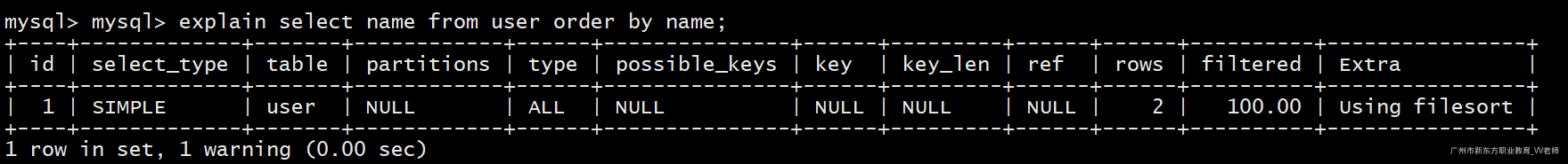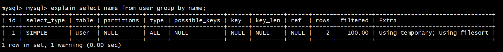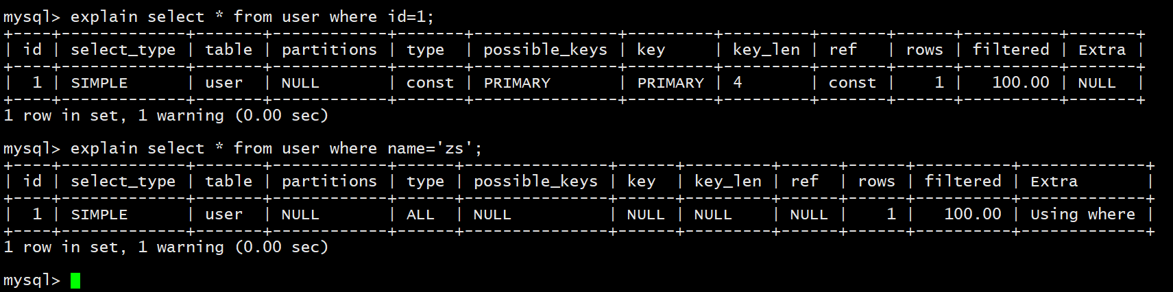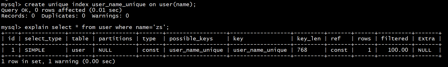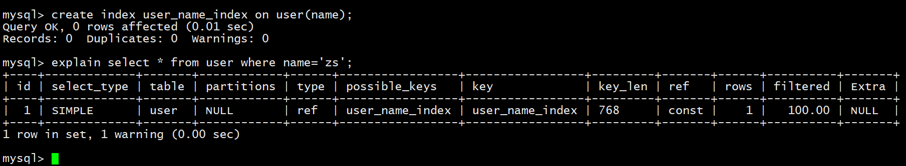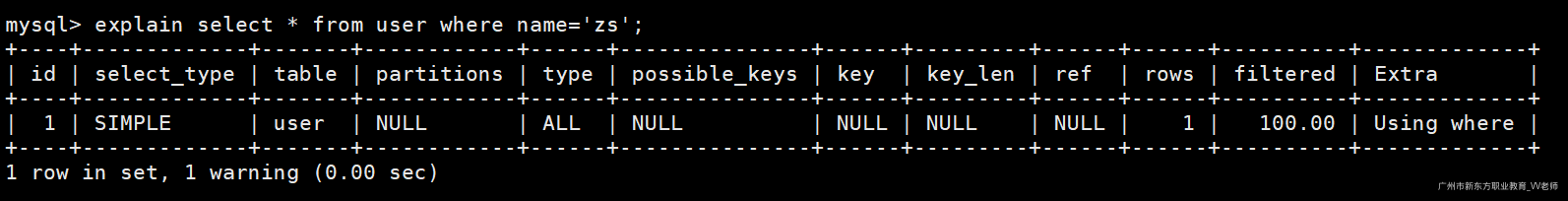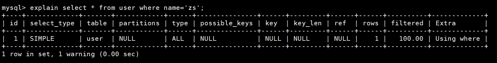 explain select * from user where name='zs';