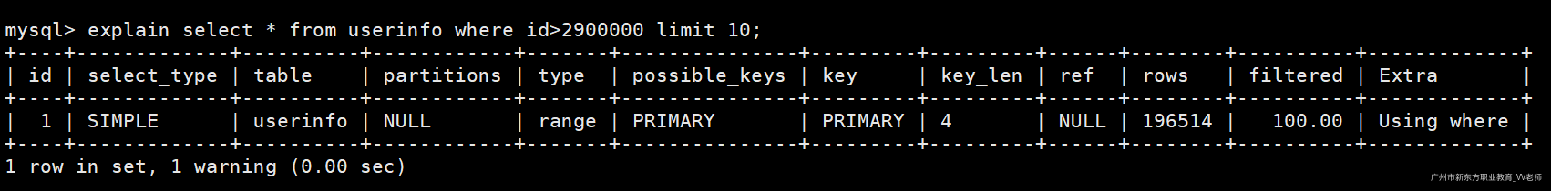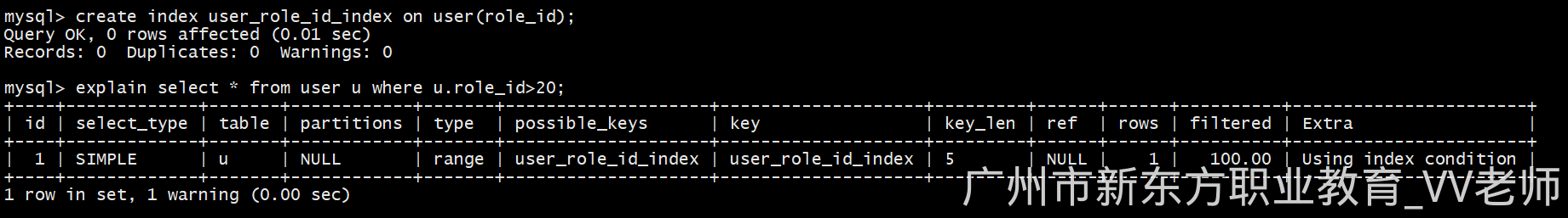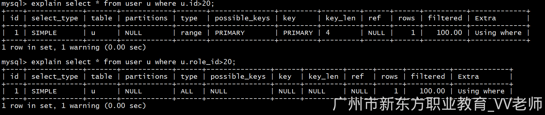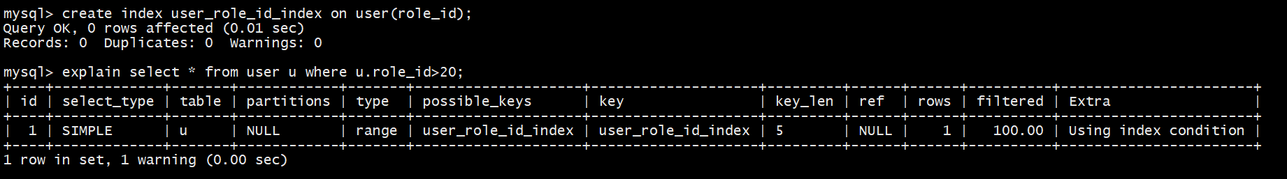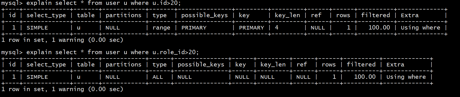 explain select * from user u where u.role_id>20; -- 使用普通列进行范围查询