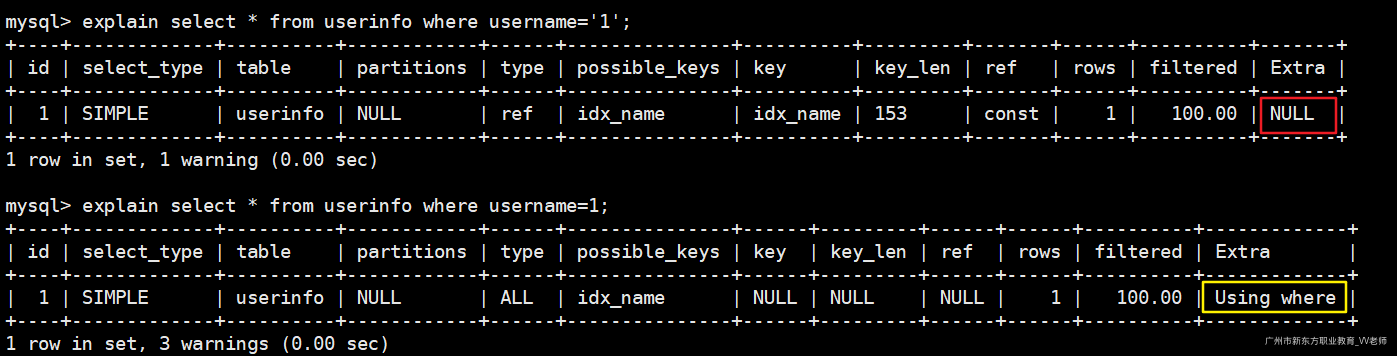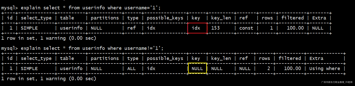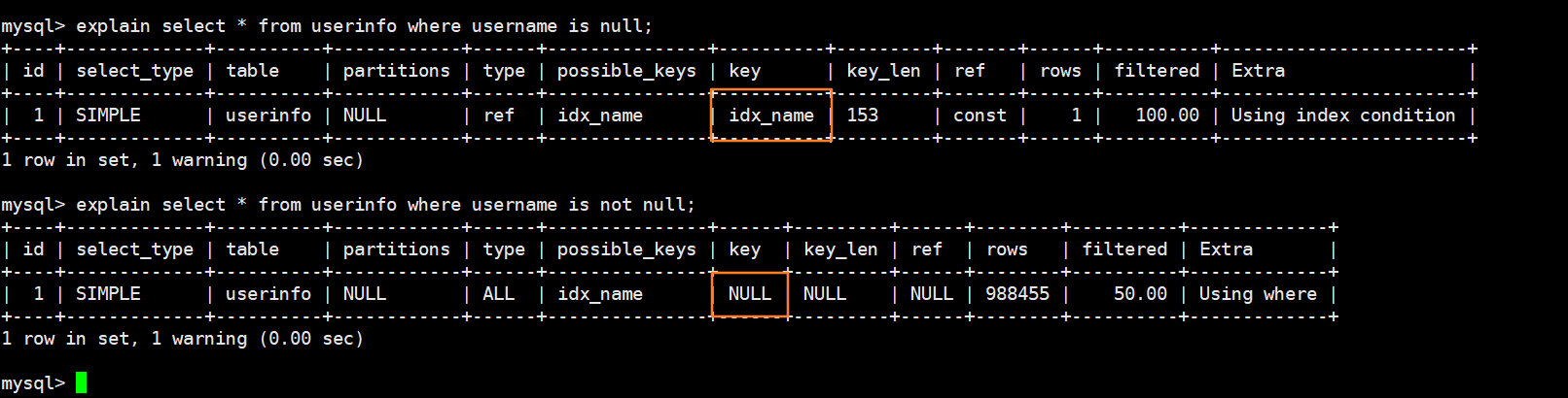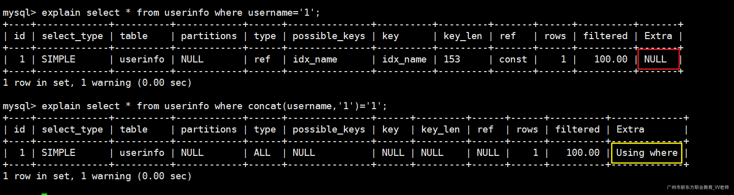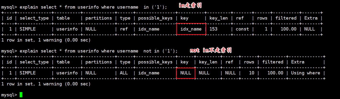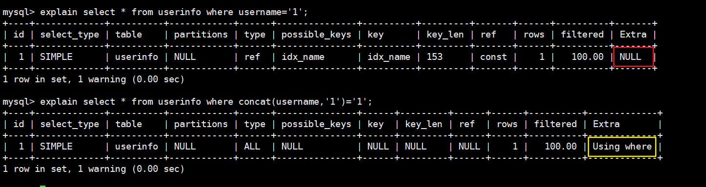 我们执行如下两句sql查看执行计划: