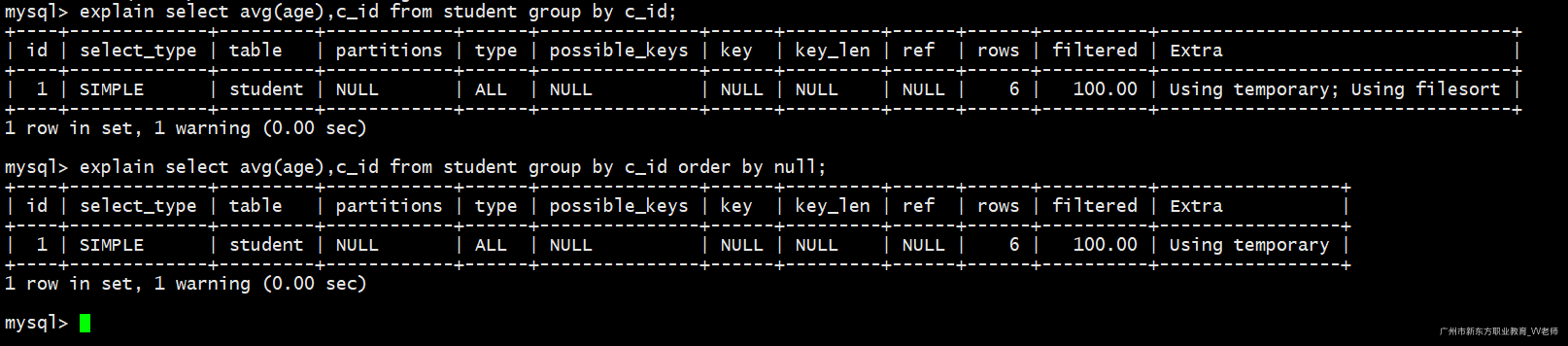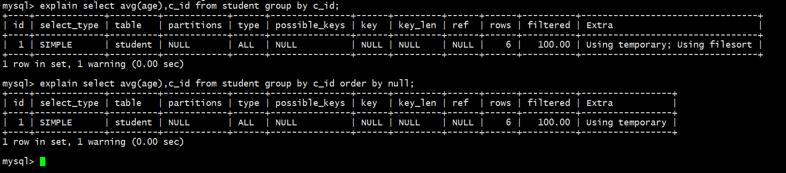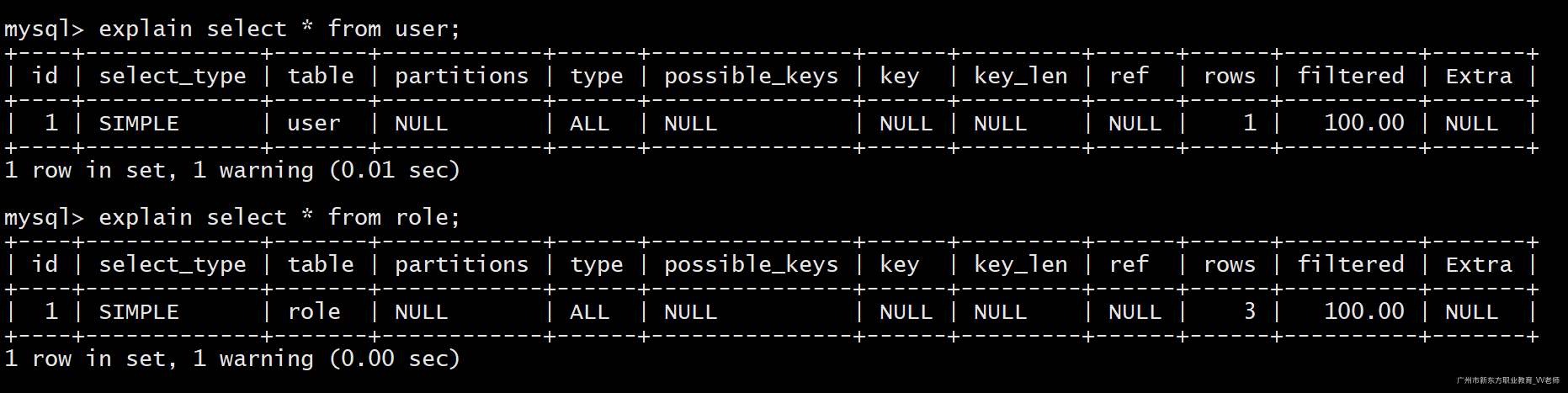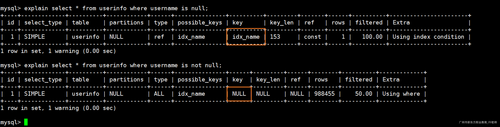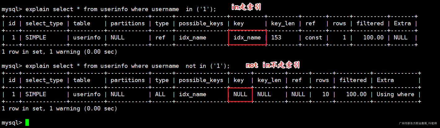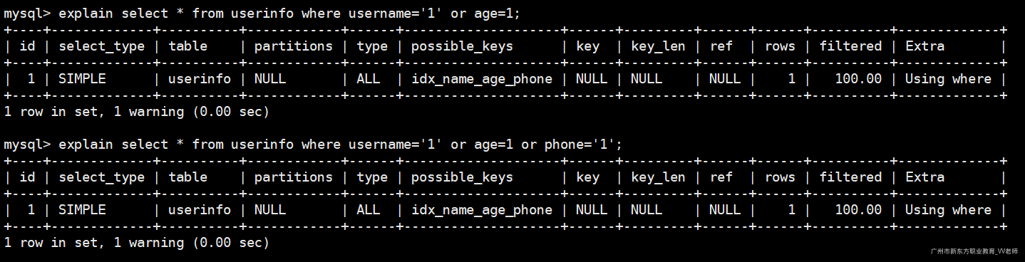 我们执行如下两句sql查看执行计划: