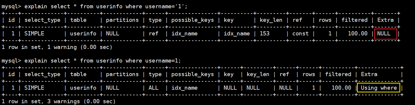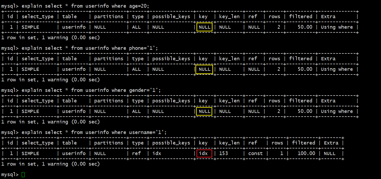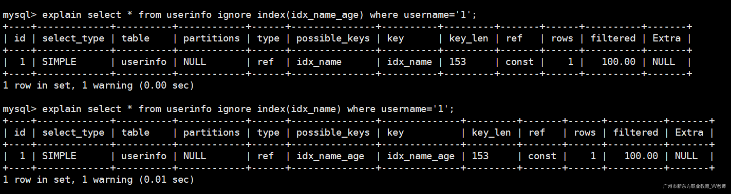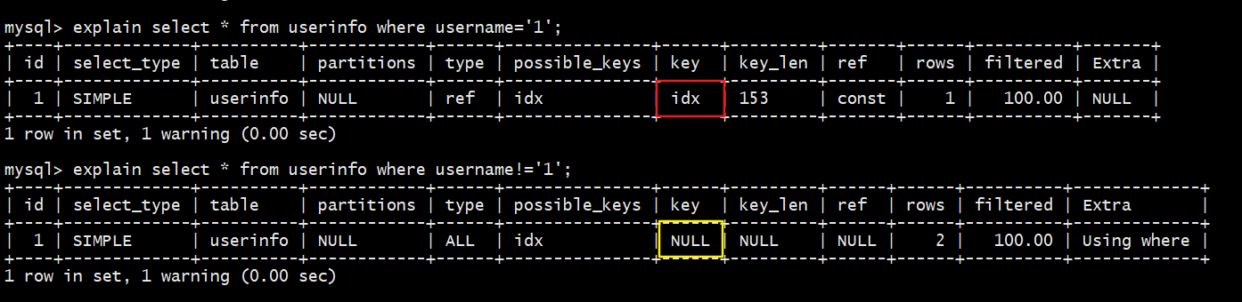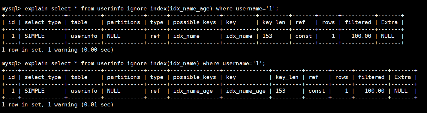 explain select * from userinfo ignore index(idx_name) where username='1';